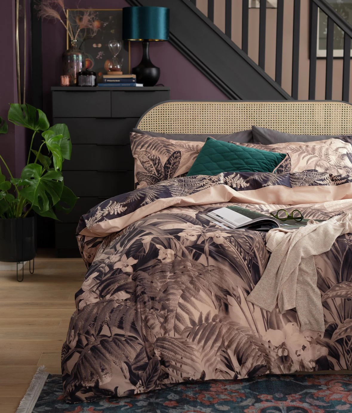 Tastefully tropical bedding. Our blush duvet set has a dramatic botanical design. Exotic foliage takes on a subtle darkness as if caught in a Caribbean sunset. Get the picture? Made from 100 cotton percale with a luxe 200 thread count it feels as good as it looks. And there's another side to this reversible bedding set, simply turn over to display a different scene. Bold and beautiful.
