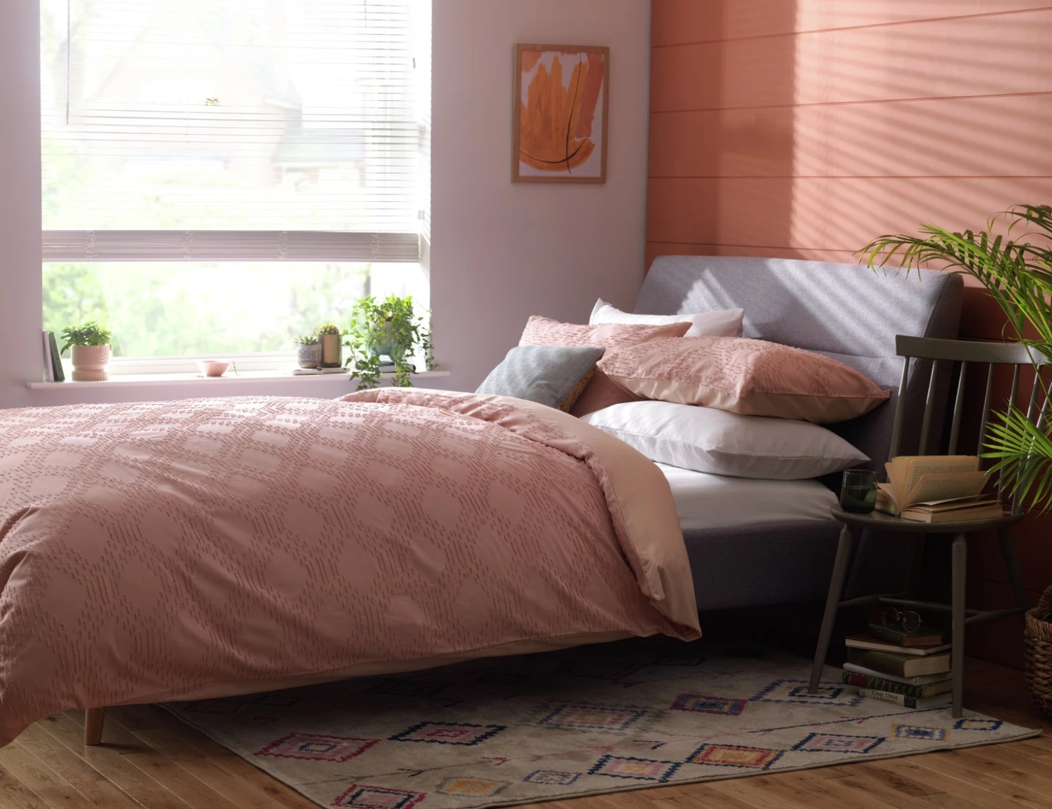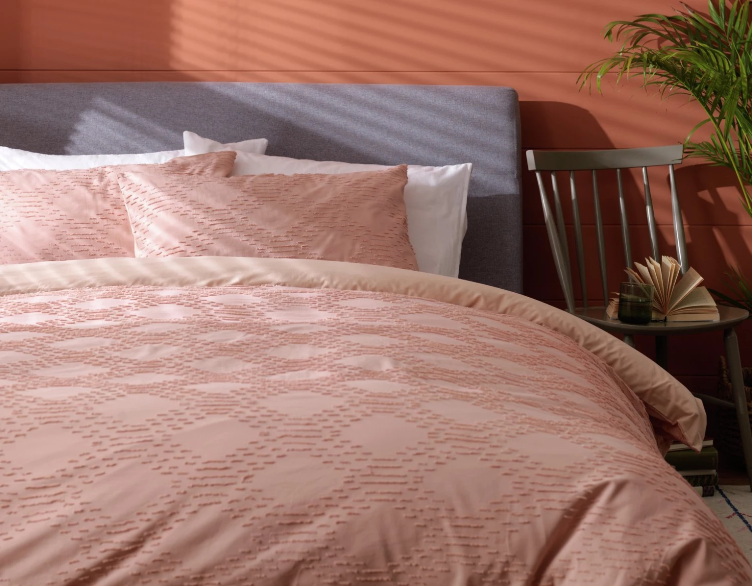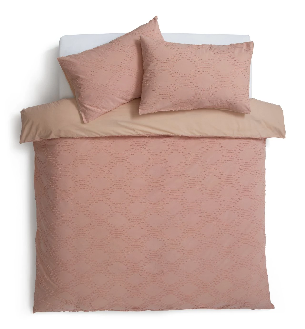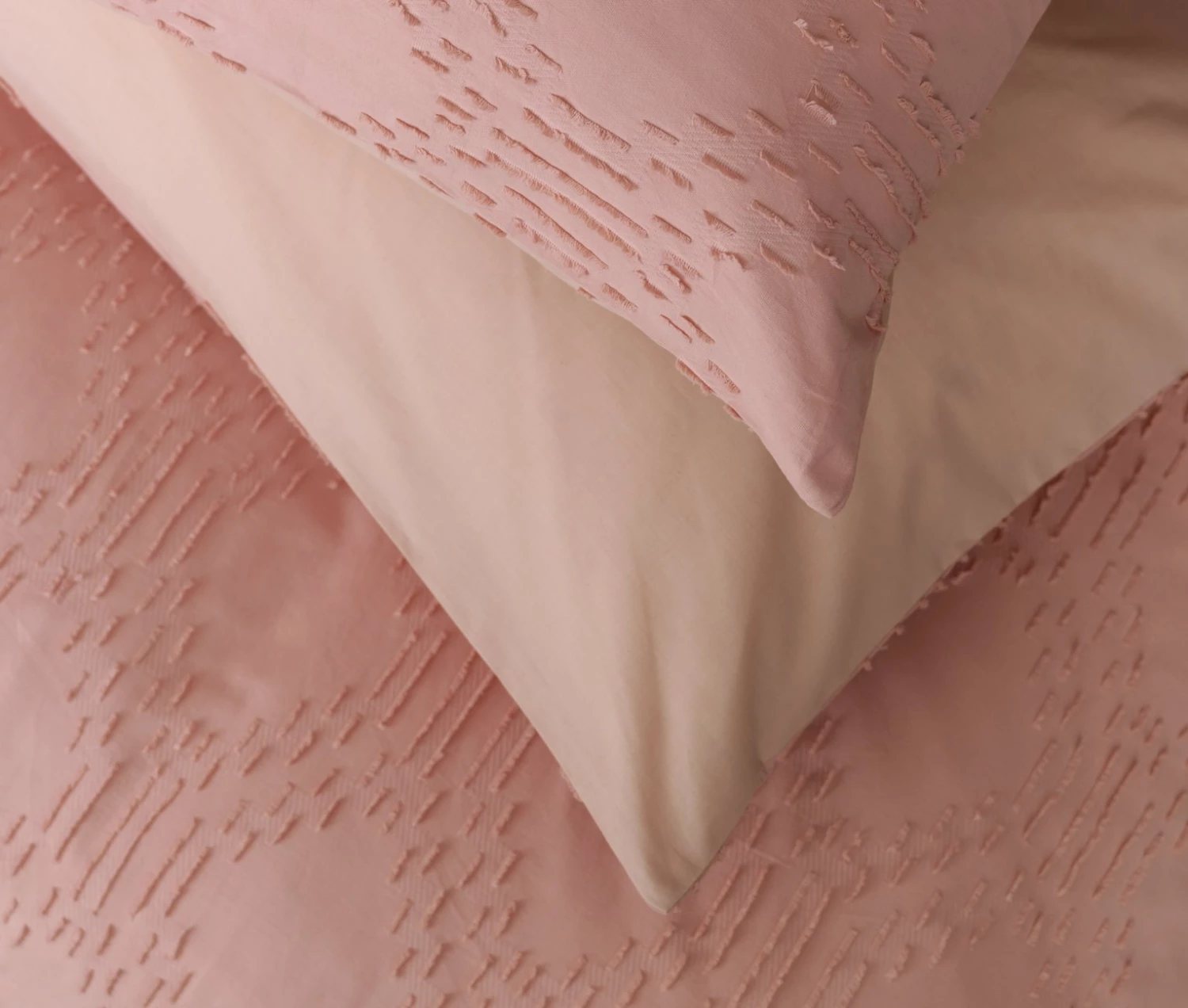 Luxury nights in. Create a sumptuous retreat in your bedroom with our Geo bedding set in blush. Light pink with cut out geometric patterns, it perfectly channels the luxe trend with its extra sense of depth and squishability. On the reverse is solid baby pink, which creates a pretty contrast when folded over.