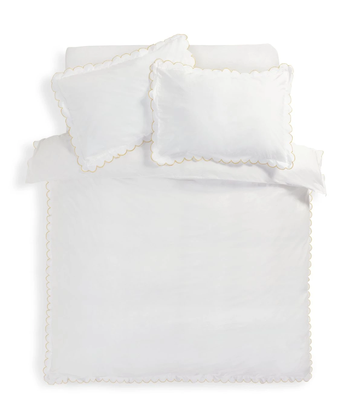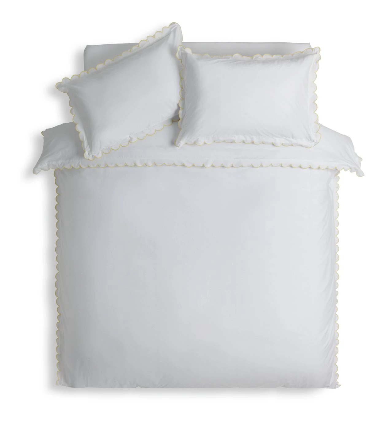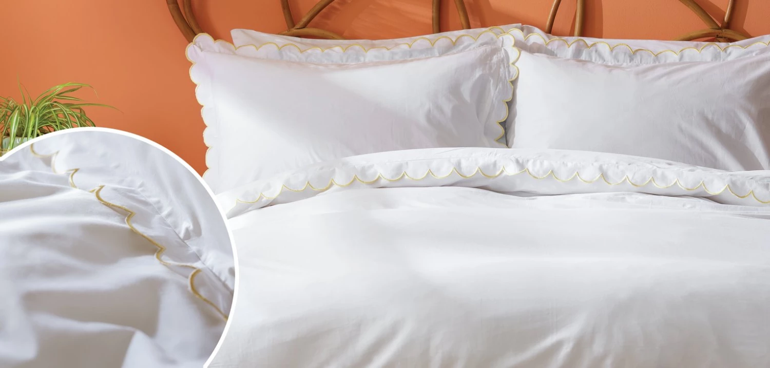 Fresh cotton bedding with a retro edge. Our crisp white duvet set is enriched with an embroidered scalloped border. The warm yellow edging emphasizes its curvaceous cuteness. A vibrant vintage touch. Made from 100% cotton percale it's woven for softness and longevity. Classically elegant, with an added frill.