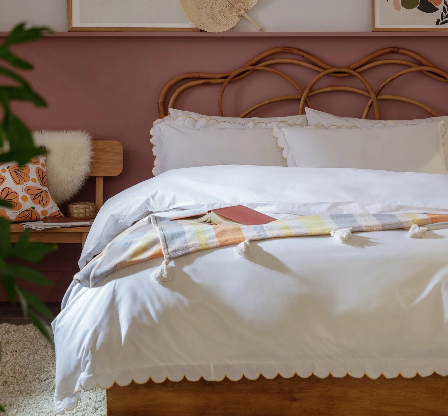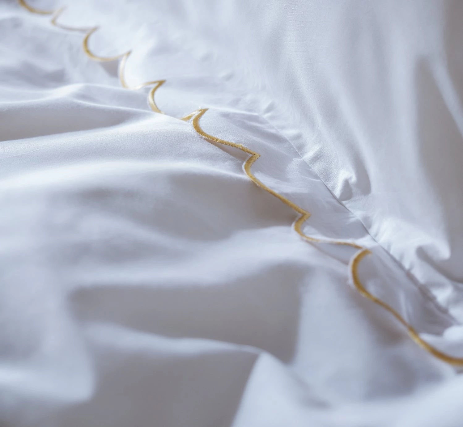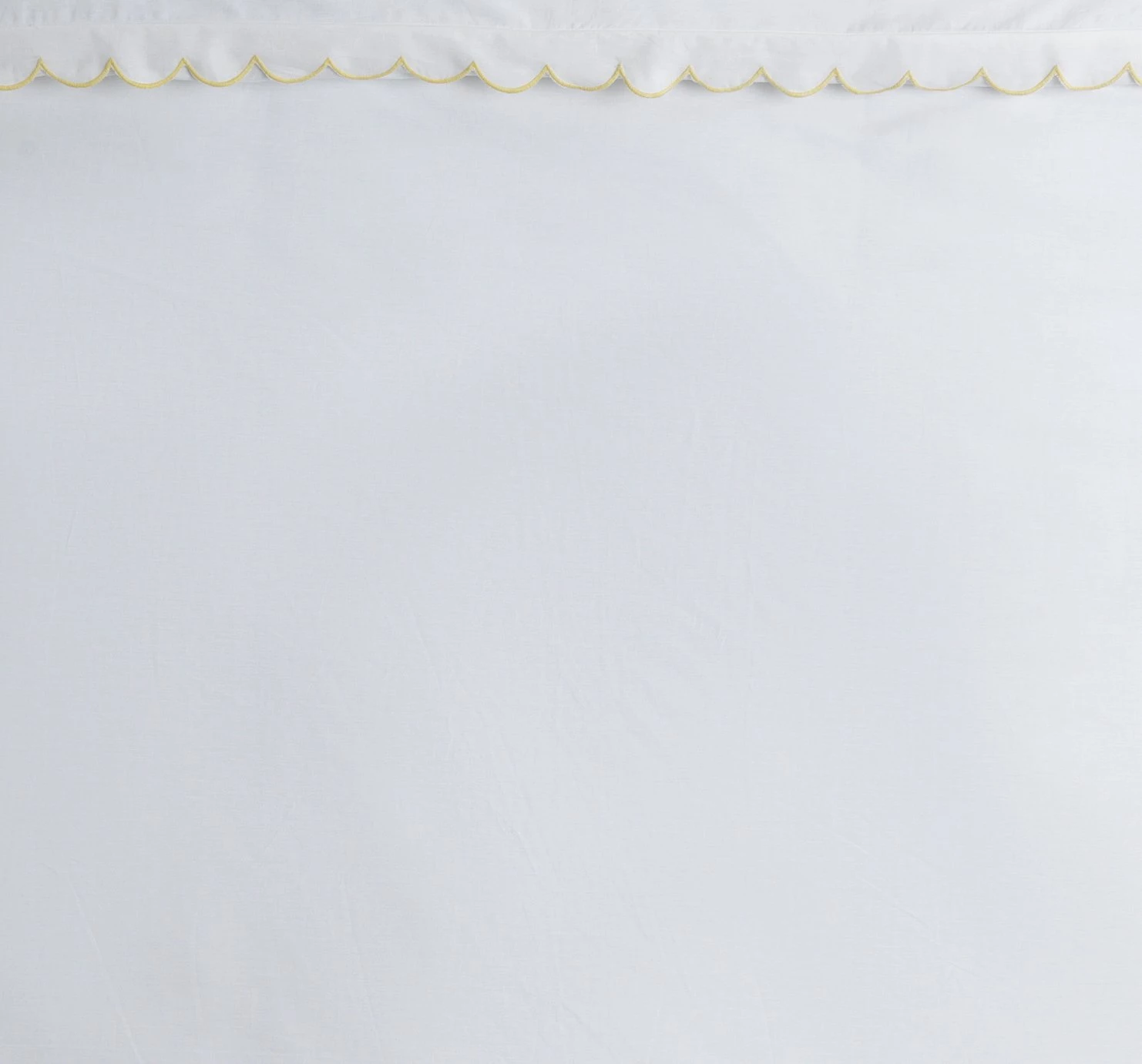 Fresh cotton bedding with a retro edge. Our crisp white duvet set is enriched with an embroidered scalloped border. The warm yellow edging emphasizes its curvaceous cuteness. A vibrant vintage touch. Made from 100% cotton percale it's woven for softness and longevity. Classically elegant, with an added frill.