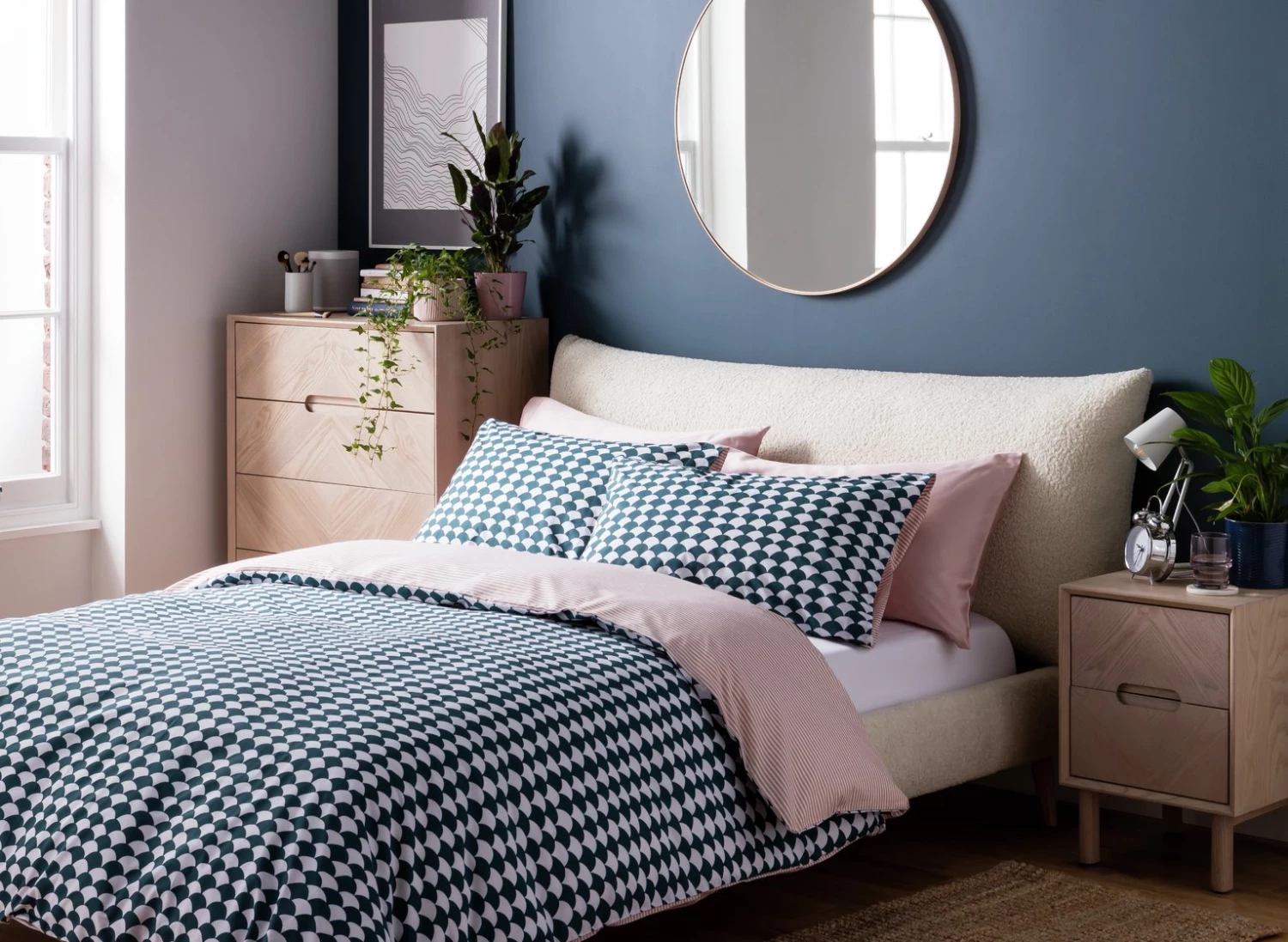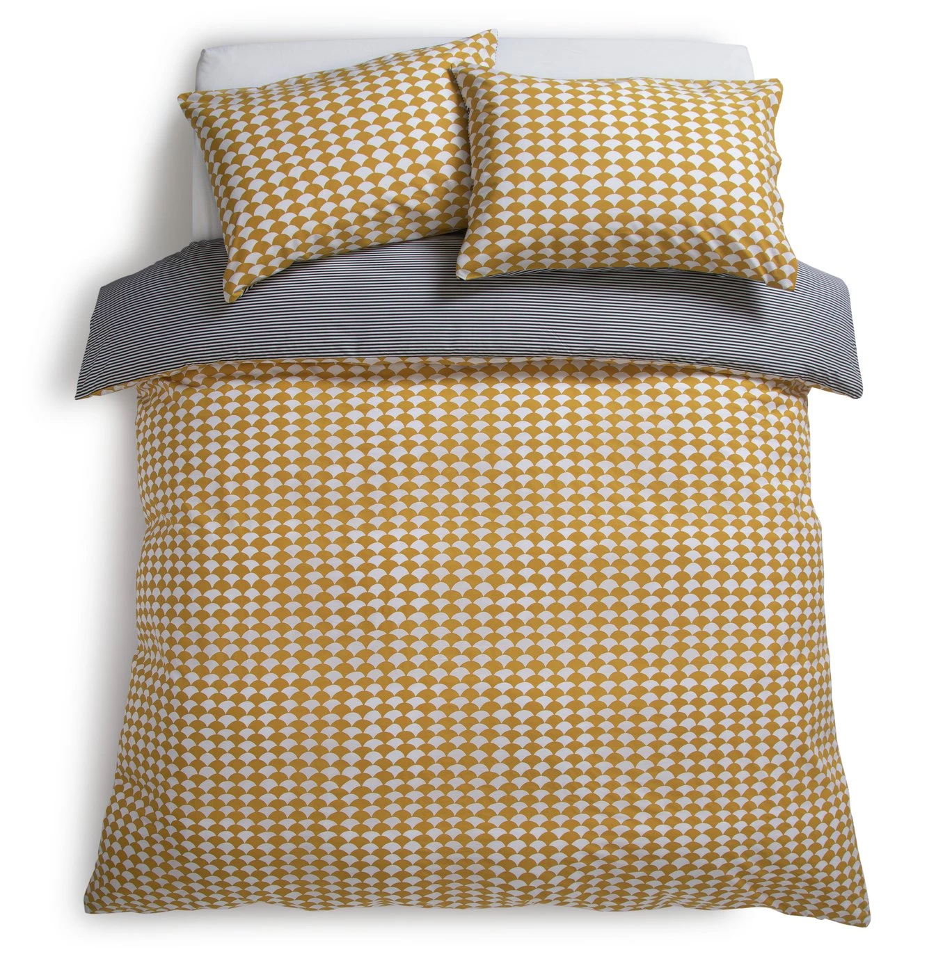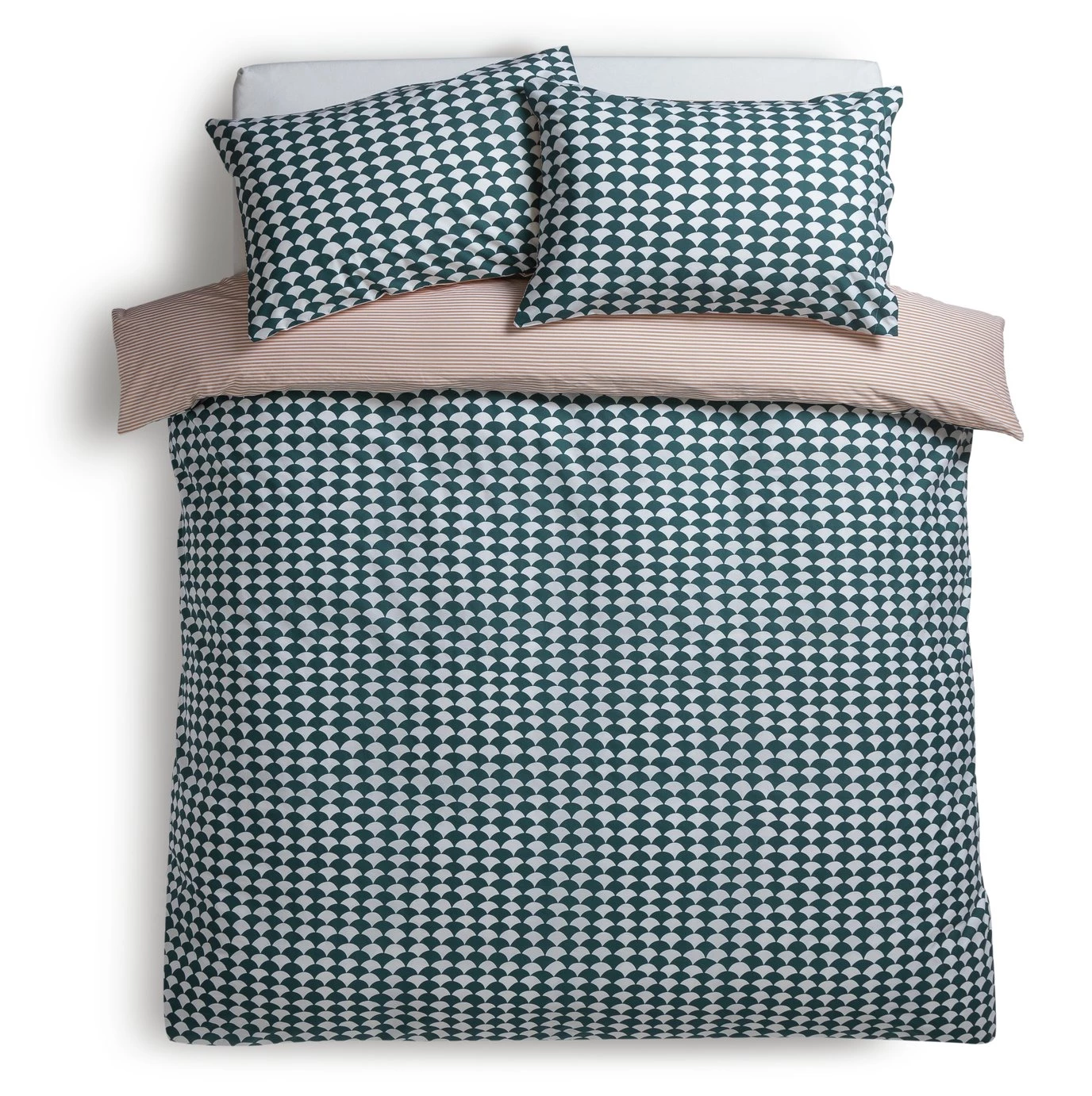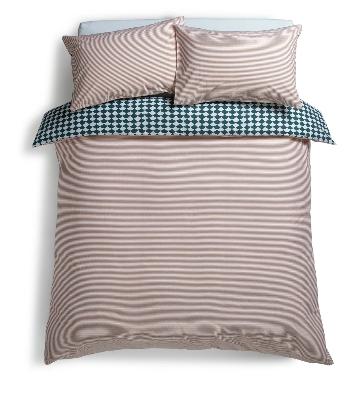 Designer's delight. Our Scallop bedlinens feature a teal scallop graphic on one side and a pink pinstripe on the other. 100% cotton and a 180-thread count make them cosy to sink down into at the end of the day. A true design classic, Scallop fits with any decor style from Scandi to modern to country house. And this great value double set comes with 2 pillowcases and a duvet cover.