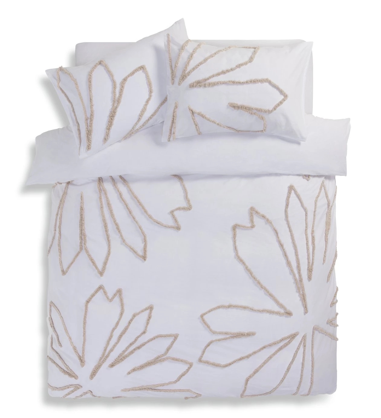 Bring a touch of Mediterranean minimalism to your boudoir with our tufted palm duvet set. Cosy in 100% cotton and covered in bold, textured leaf patterns. It's irresistibly tactile and your bedroom will bloom. Snuggle in for a luxuriously long snooze. Pair with lush green plants and neutral furnishings for a fresh, airy feel. It's siesta o'clock.