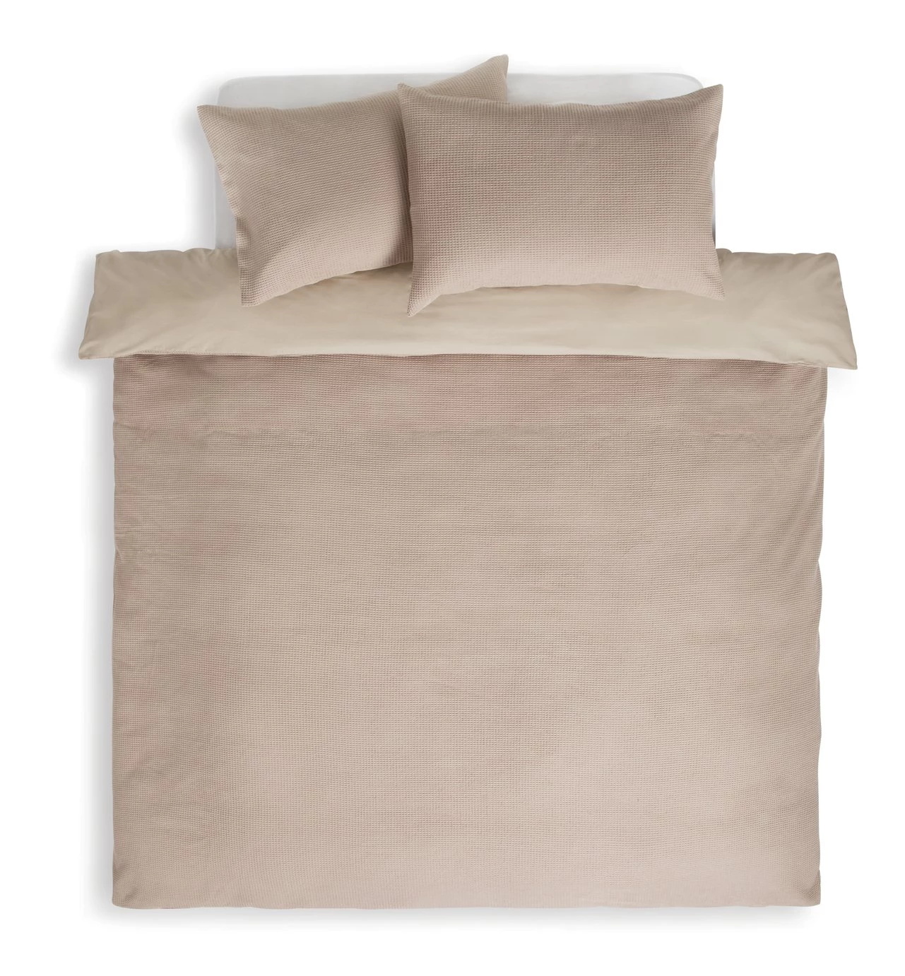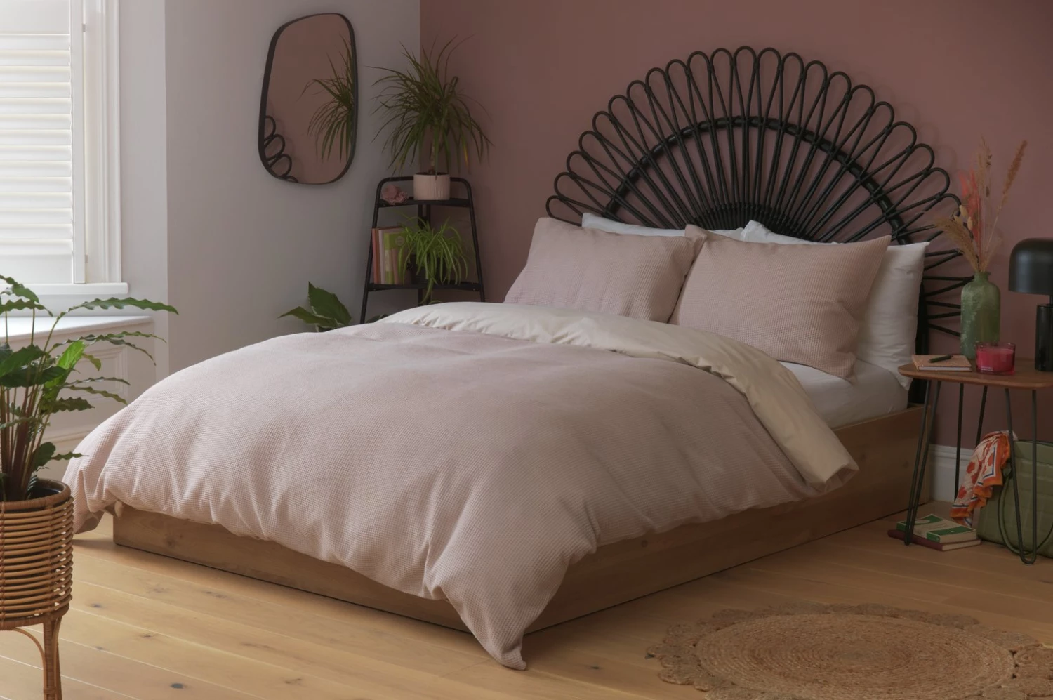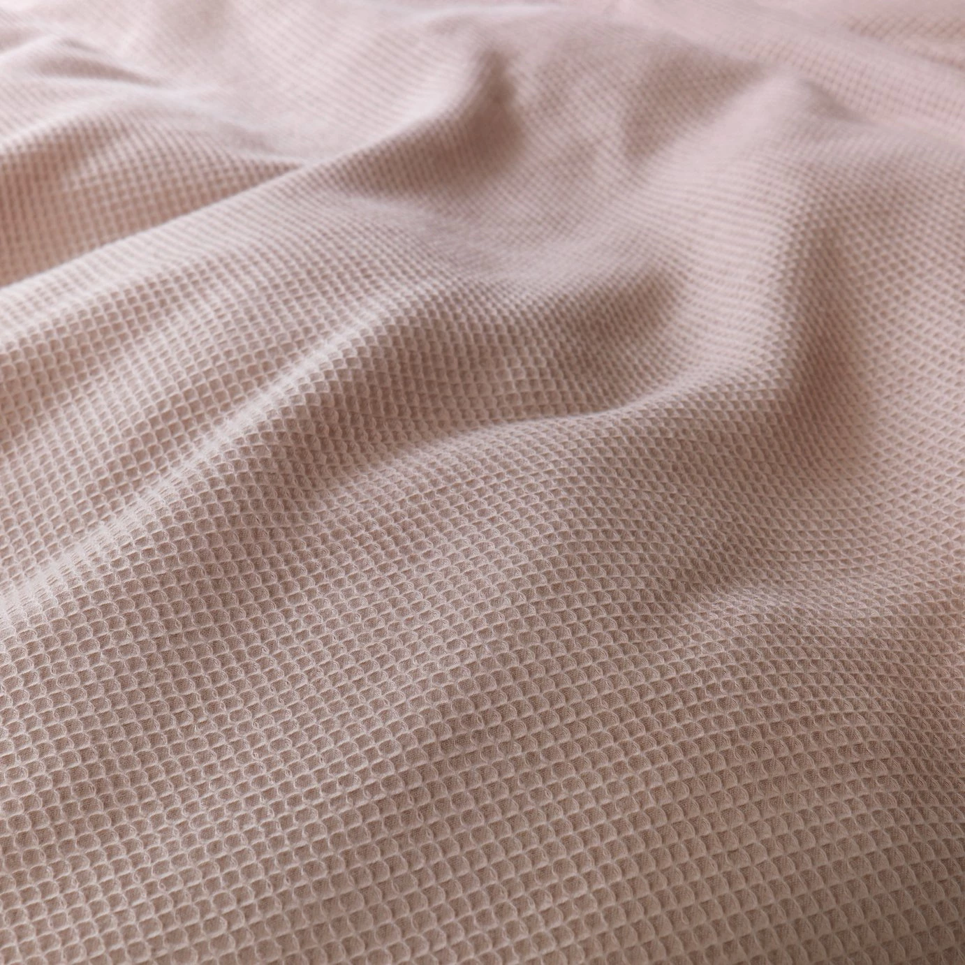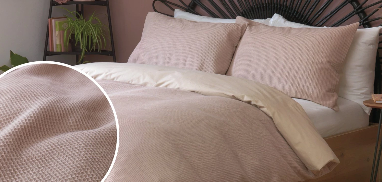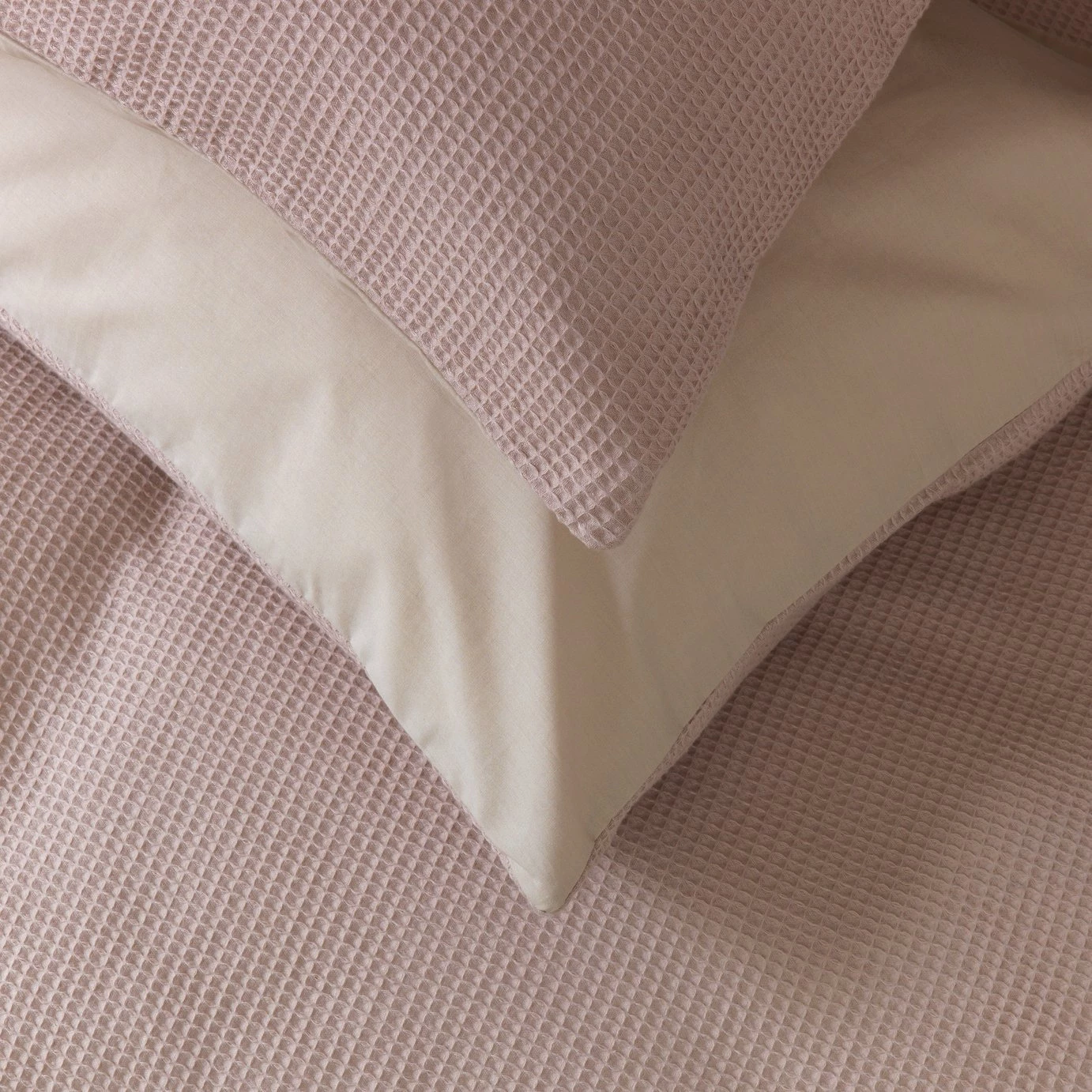 Get a good night's rest with this pink double bedding set. The romantic blush colour and soft 100% cotton fabric adds a relaxing touch. Feels like heaven. Includes 1 pillowcases and a waffle duvet that's durable, breathable and a pleasure to fall asleep in. Afternoon naps or bedtime, it's just sublime. Once you rise and shine, use the fastening buttons to keep everything tidy. Ta dah! As good as new. Sweet dreams.