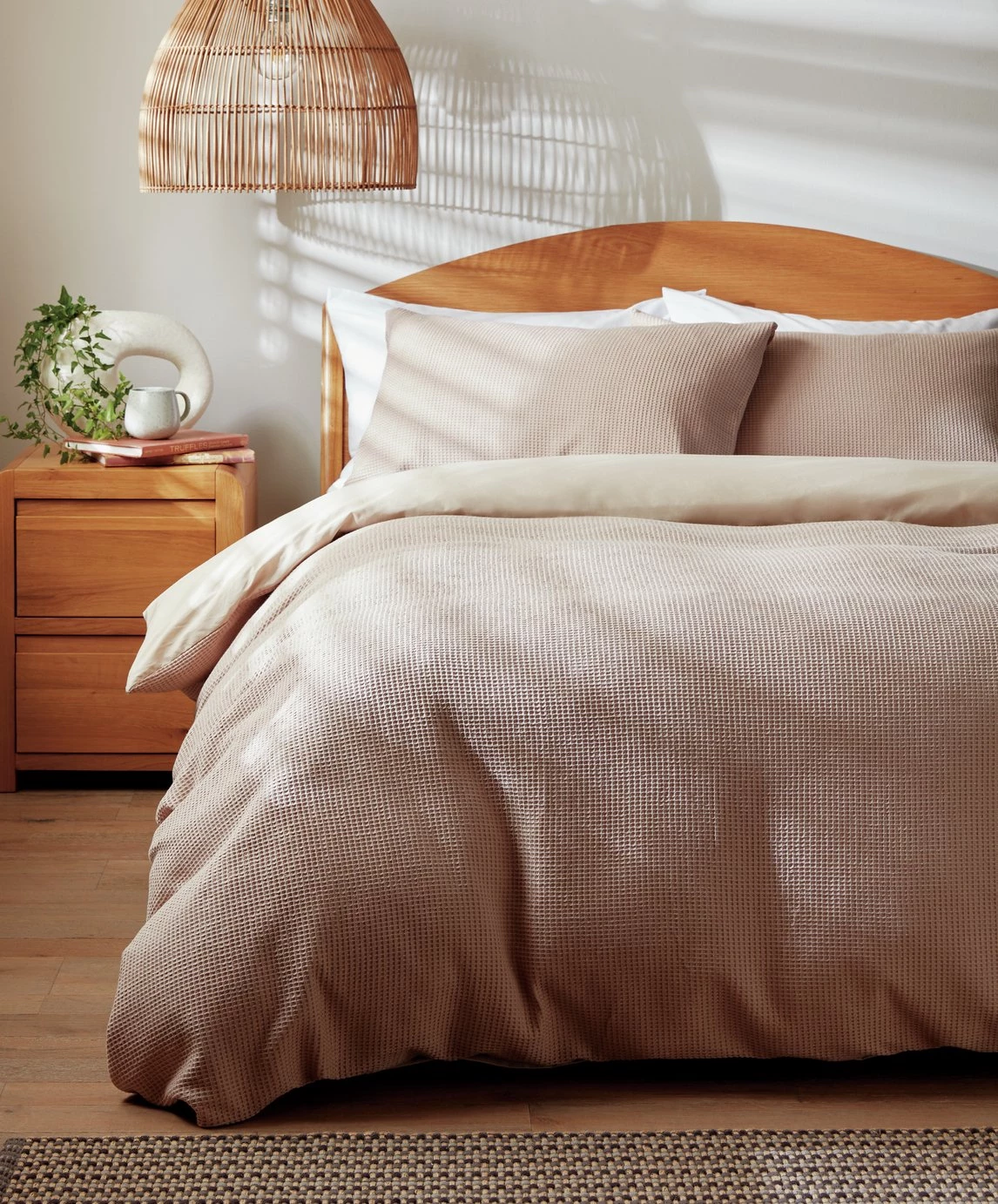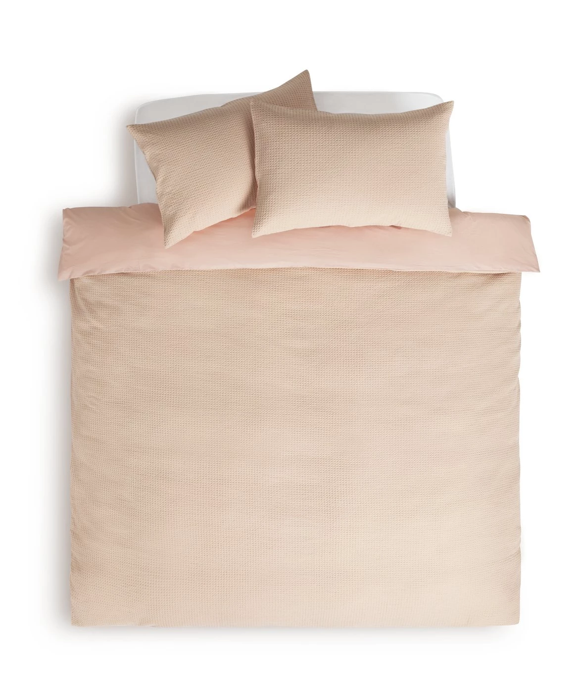 Add a contemporary twist to your bedroom and match this subtle blush duvet set with light wood and natural curves and textures.