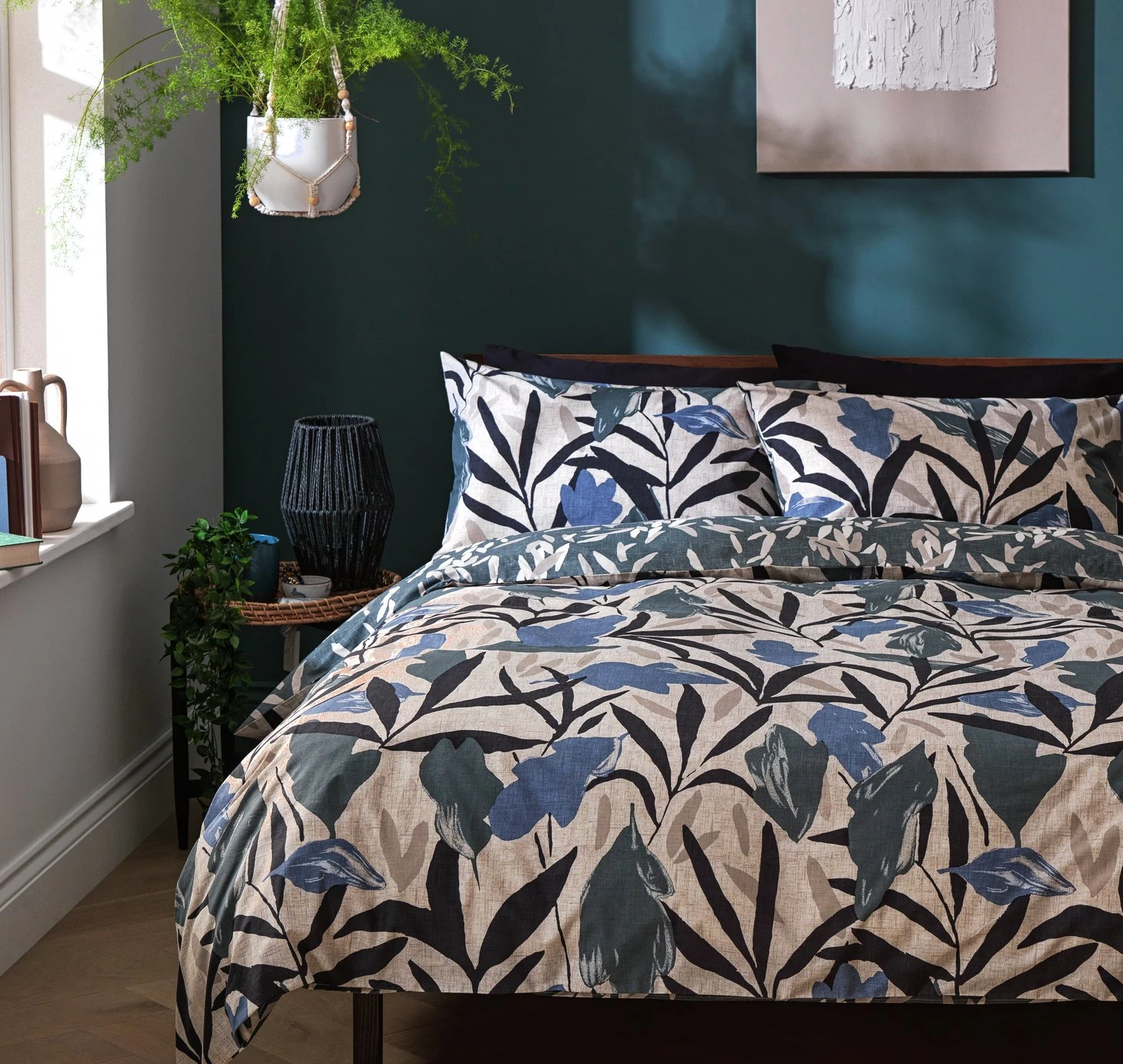 Bring botanical maximalism to your bedroom with our floral single duvet set. There's nothing chintzy about this design. Vivid blue and green graphics with strokes of black make up this striking patten. The textured blend of polyester and cotton means this reversible bedding set is soft, long lasting and easy to care for.