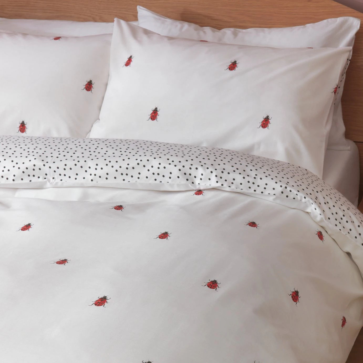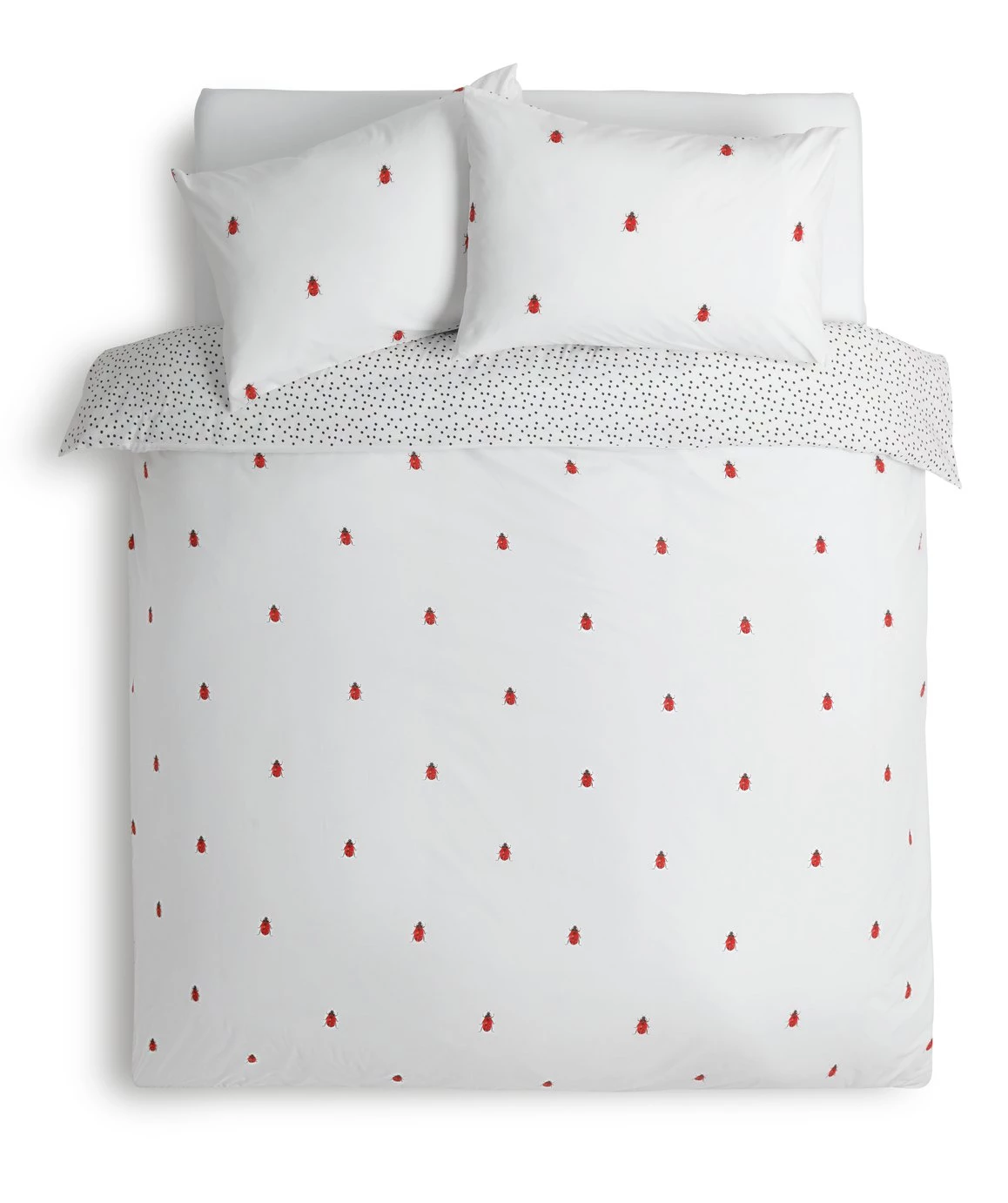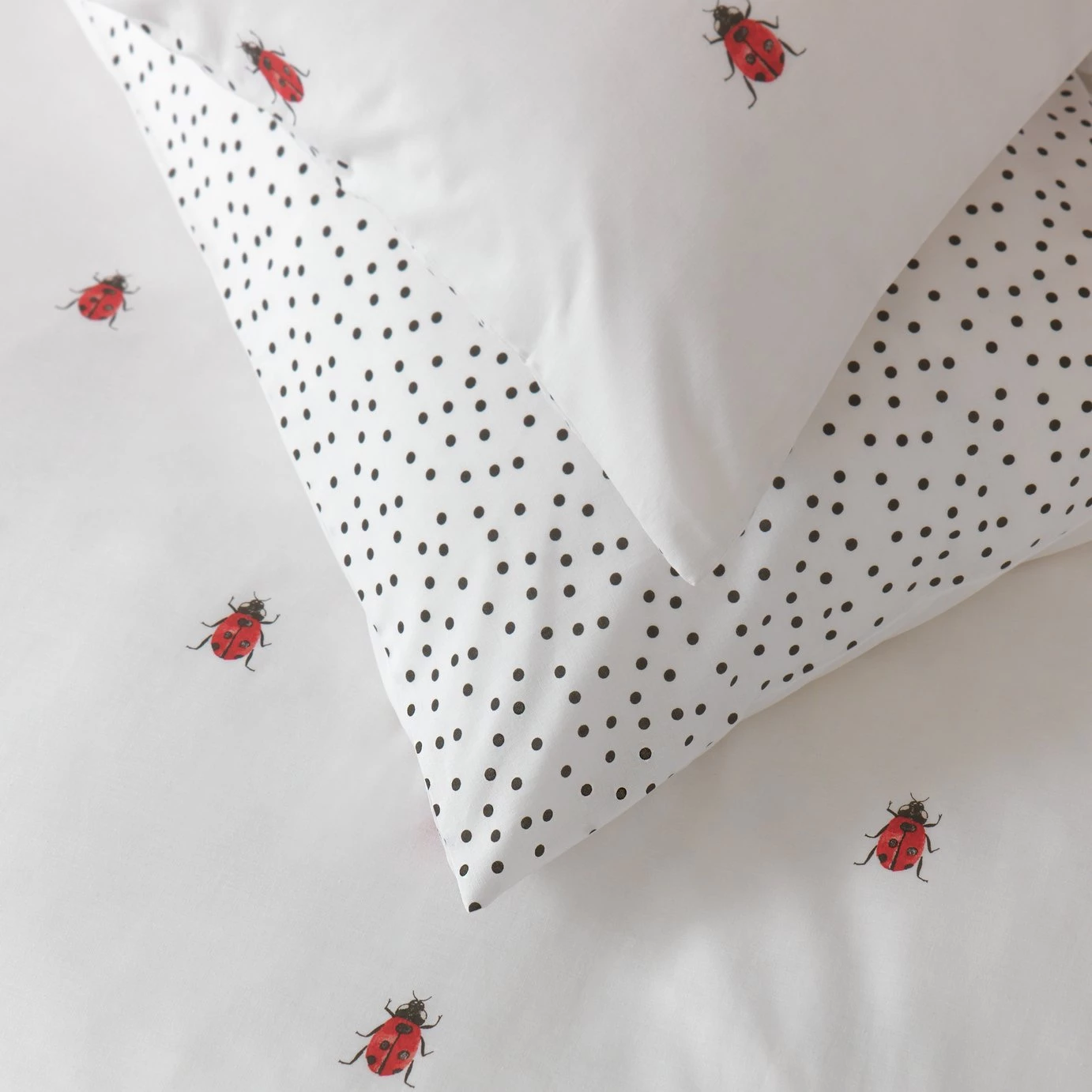 Calling all nature lovers. Go bug eyed over this sweet single duvet set. Crafted in crisp, it features a bright white side adorned with charming ladybirds and a contrasting spotted monochrome side. Mix, match and bring the outside in.