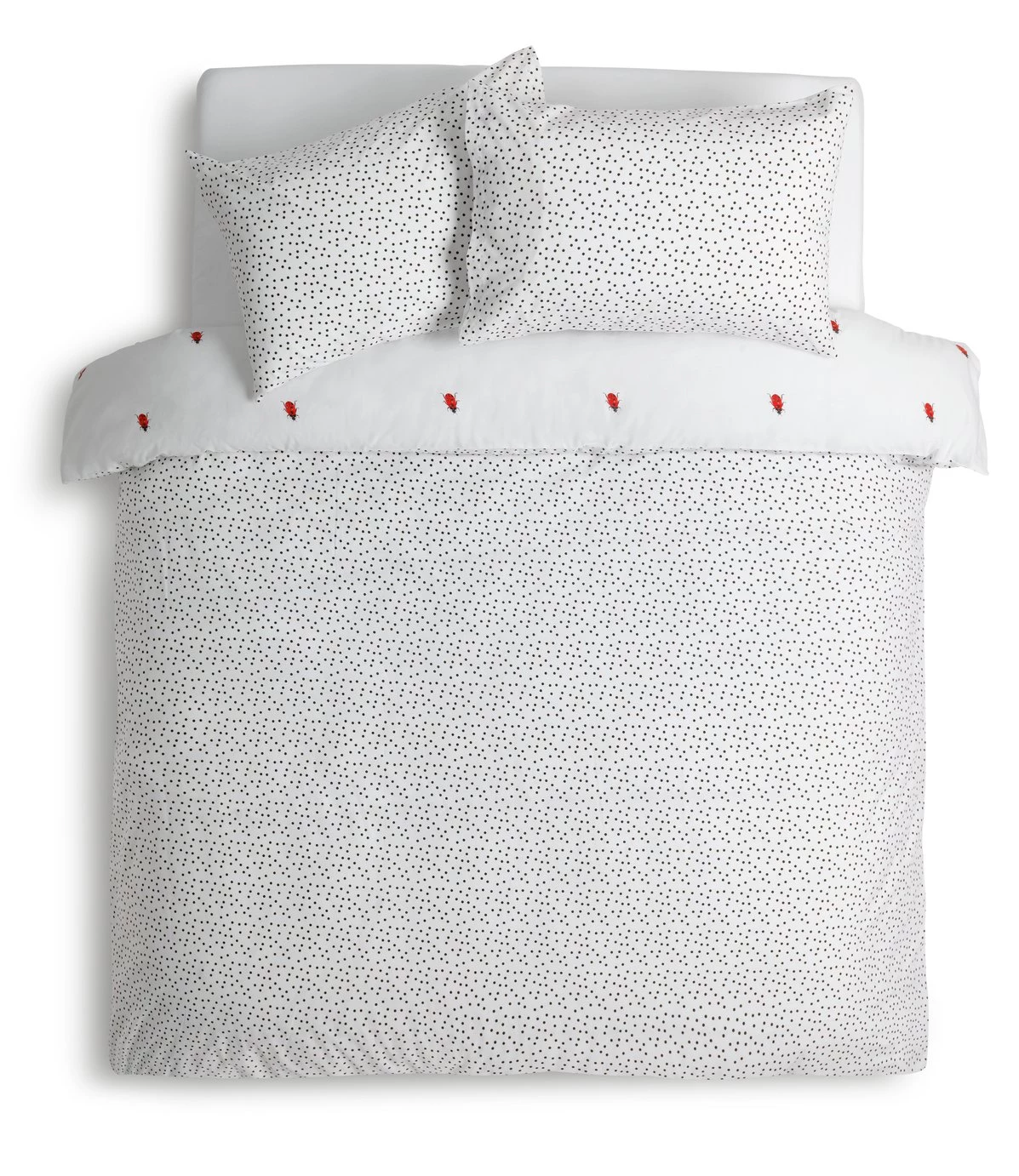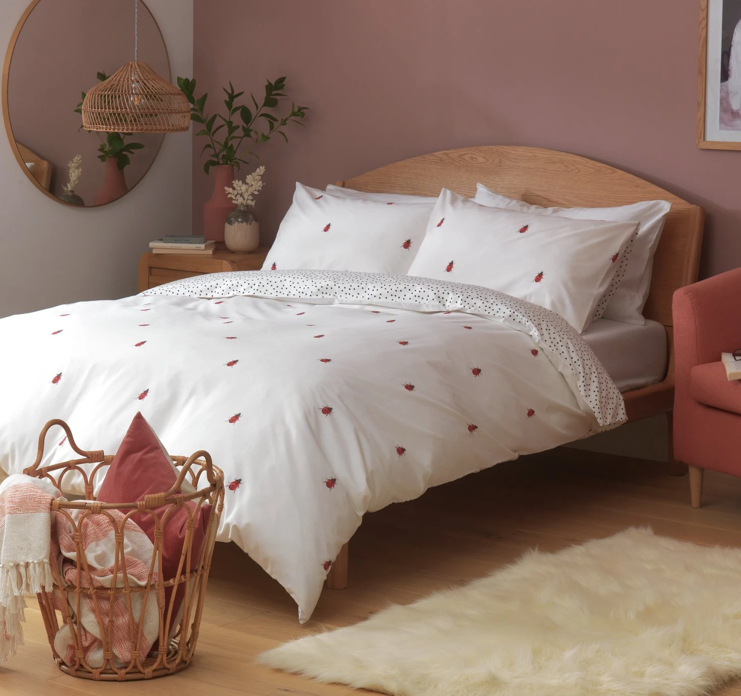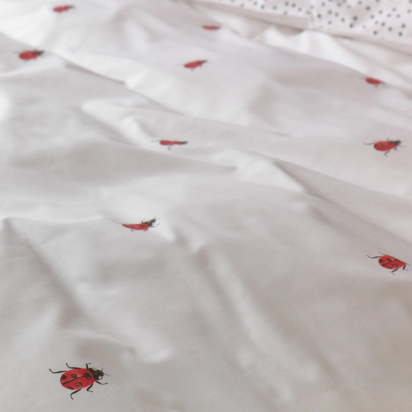 Calling all nature lovers. Go bug eyed over this sweet single duvet set. Crafted in crisp, it features a bright white side adorned with charming ladybirds and a contrasting spotted monochrome side. Mix, match and bring the outside in.