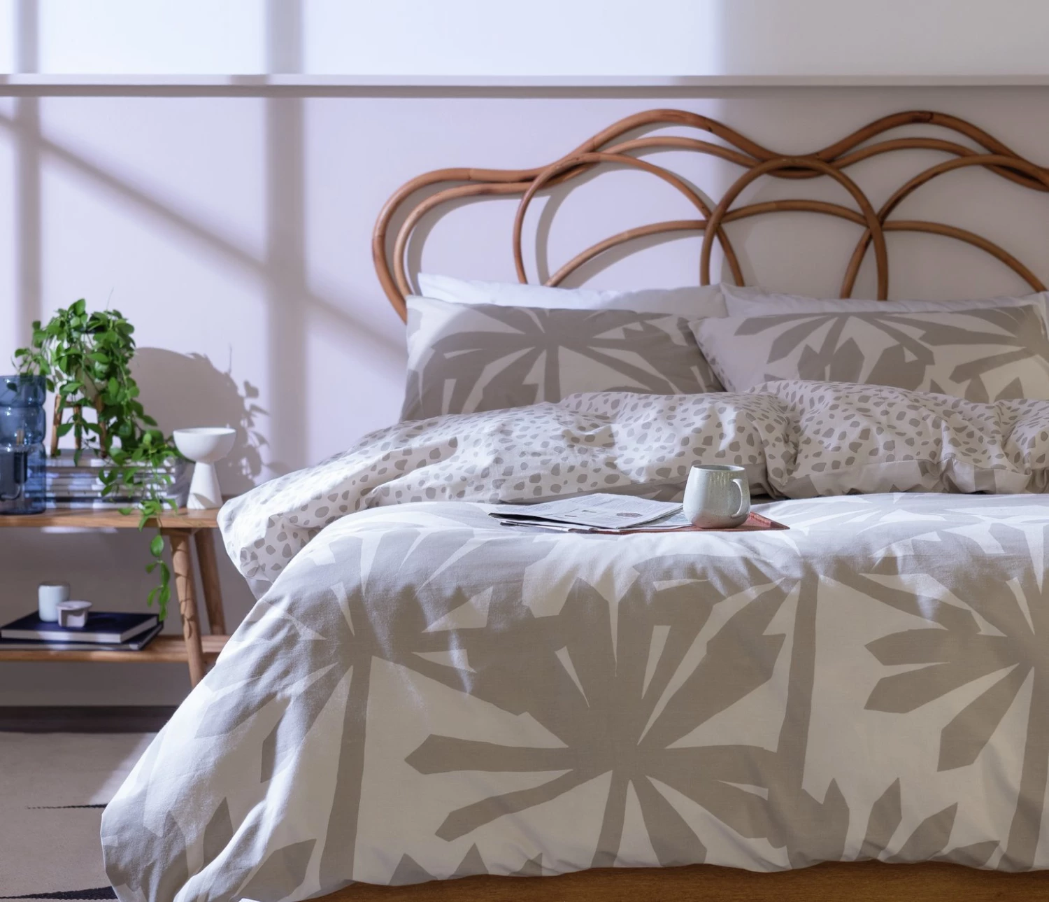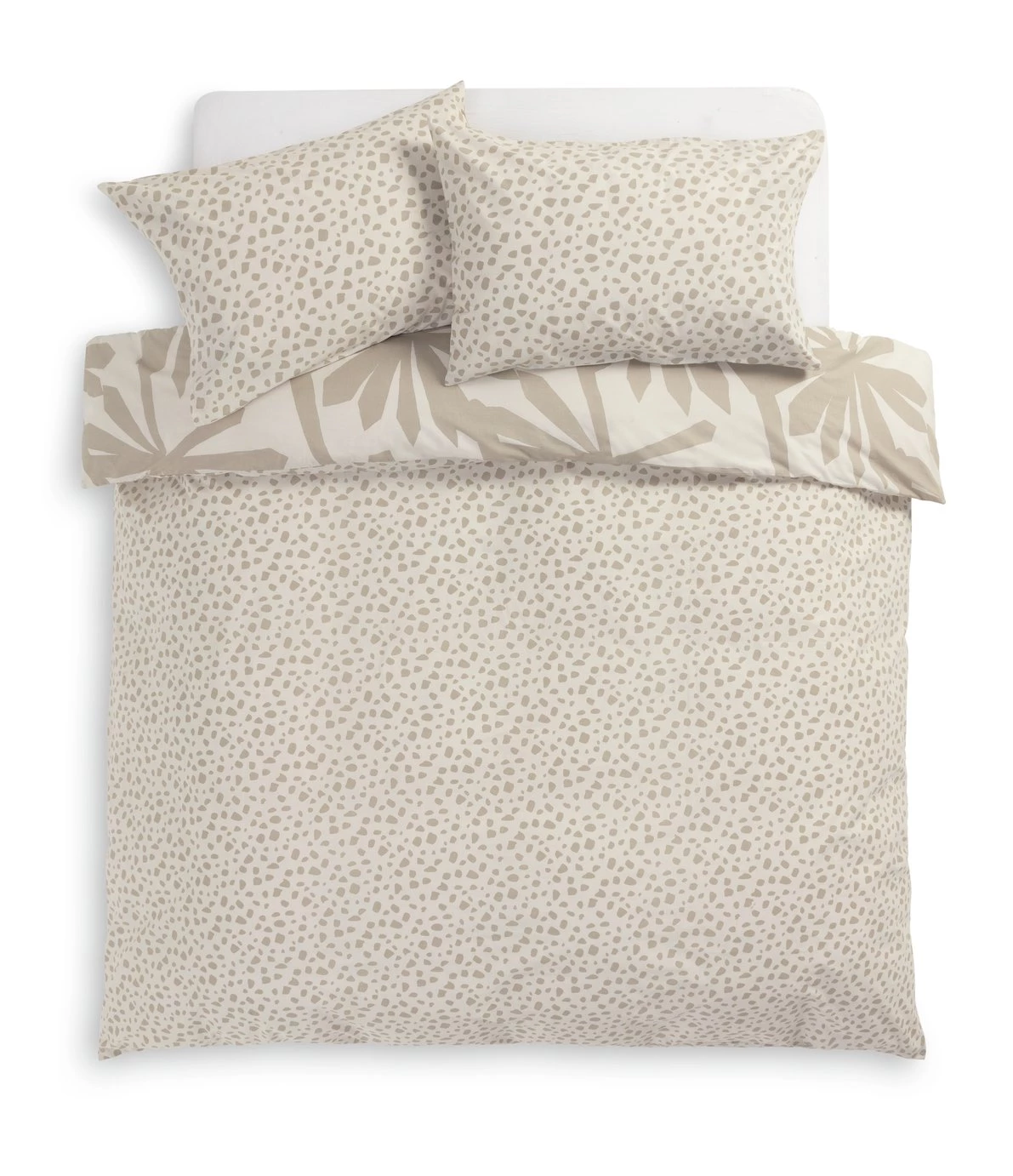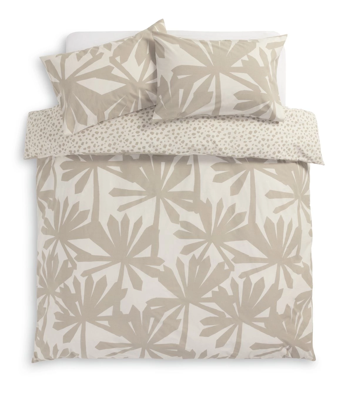 A summery spot to snooze. Our palm and pebble duvet set brings a sophisticated feel to your boudoir. Gorgeous neutral shades meet in this pretty block print for a fresh, modern look. Fully reversible, give it a flip for a change of scene. In soft polycotton, it's lightweight and durable. Buttons make for quick and easy sheet changes, too. It's nap time, naturally.