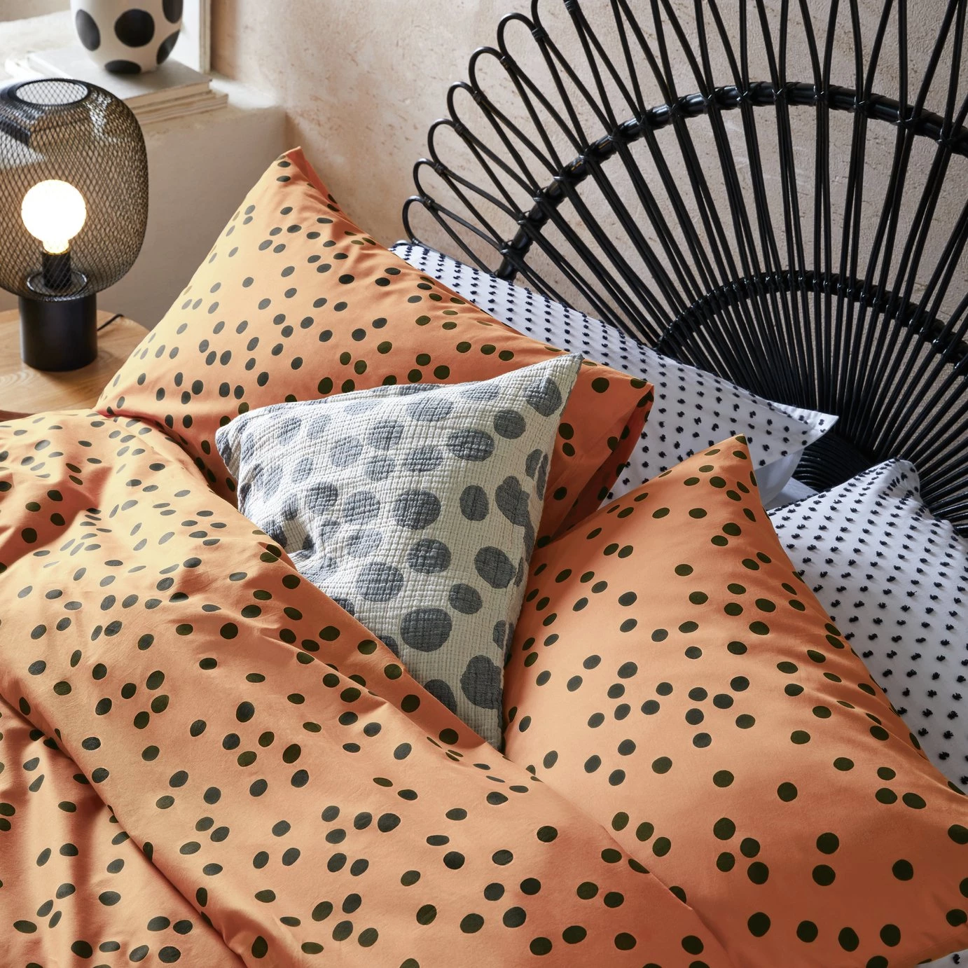 The Penny printed black and pink spot cotton pair of rectangular pillowcases has a timeless print for a soft yet striking finish. Created in the Habitat design studio, its made from 100% cotton with a 180 thread count for a super soft texture. This breathable and lightweight fabric offers a cool and comfortable nights sleep. Part of the Penny bedding range, its available in various sized sets.