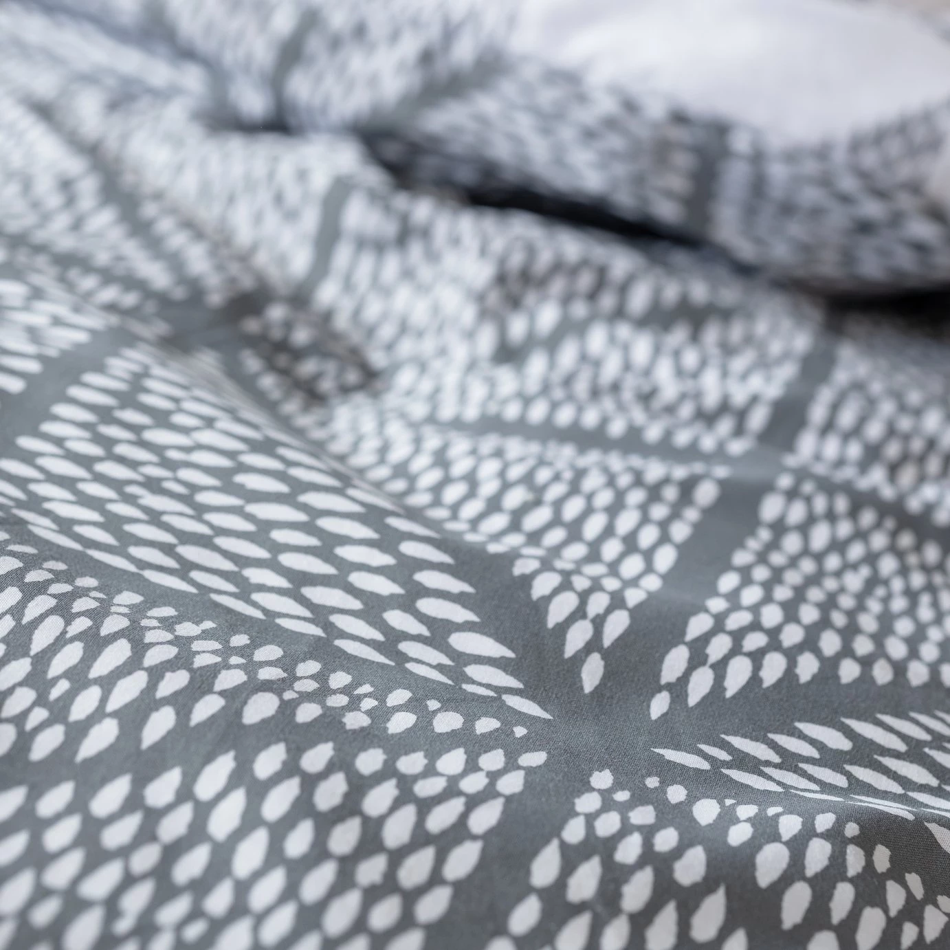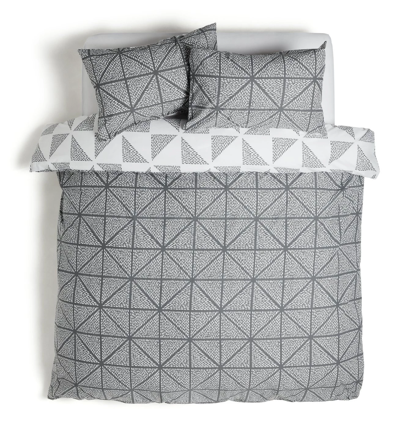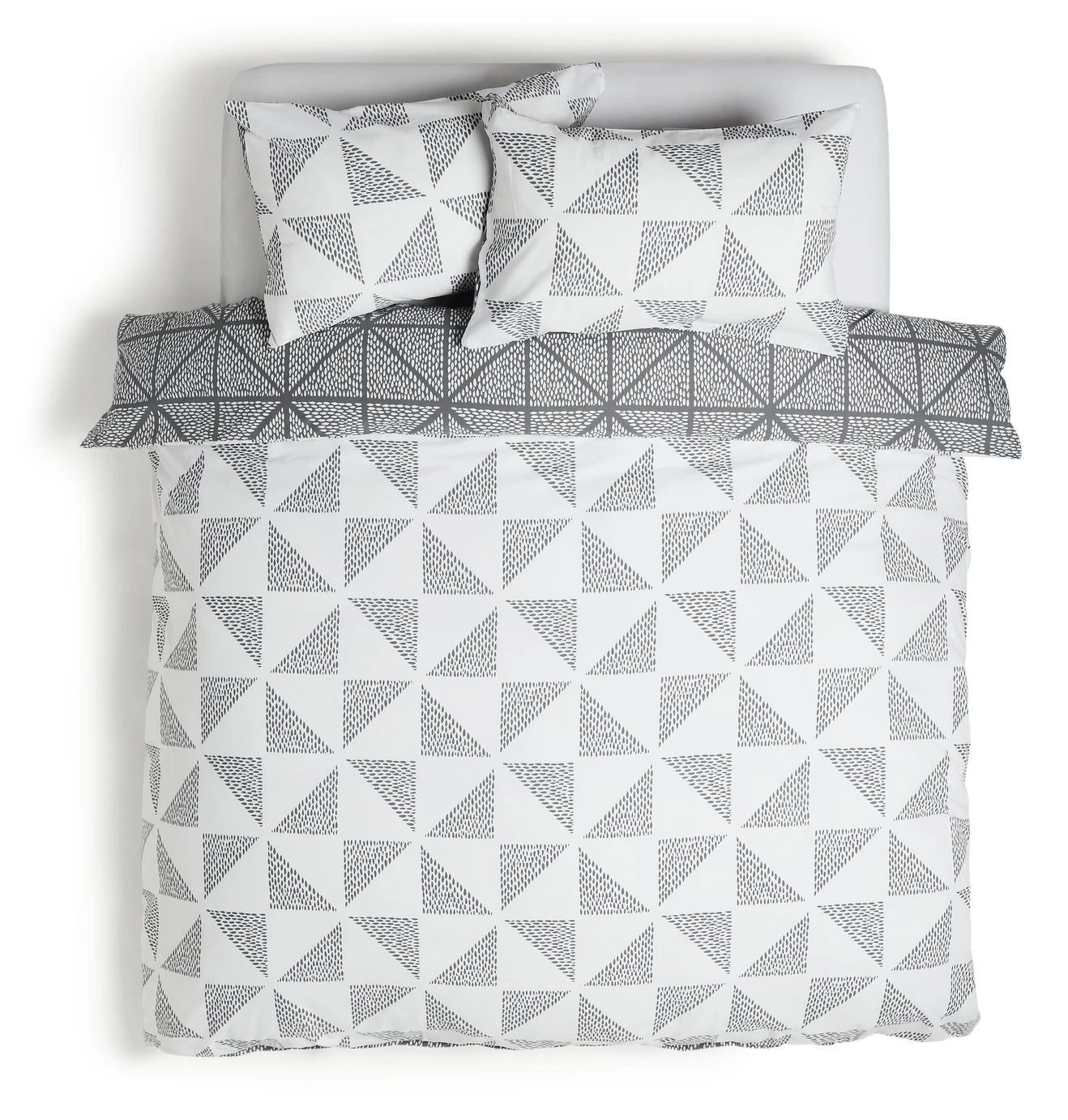 Get your sleep on with this reversible diamond patterned duvet. Go for cool grey graphics or flip it over and hit refresh with a bright white triangular design. Both give a contemporary, monochrome look. Want an easy life? Our polycotton blend is easy care and the duvet has simple button-down fastening too. Slumber in style.