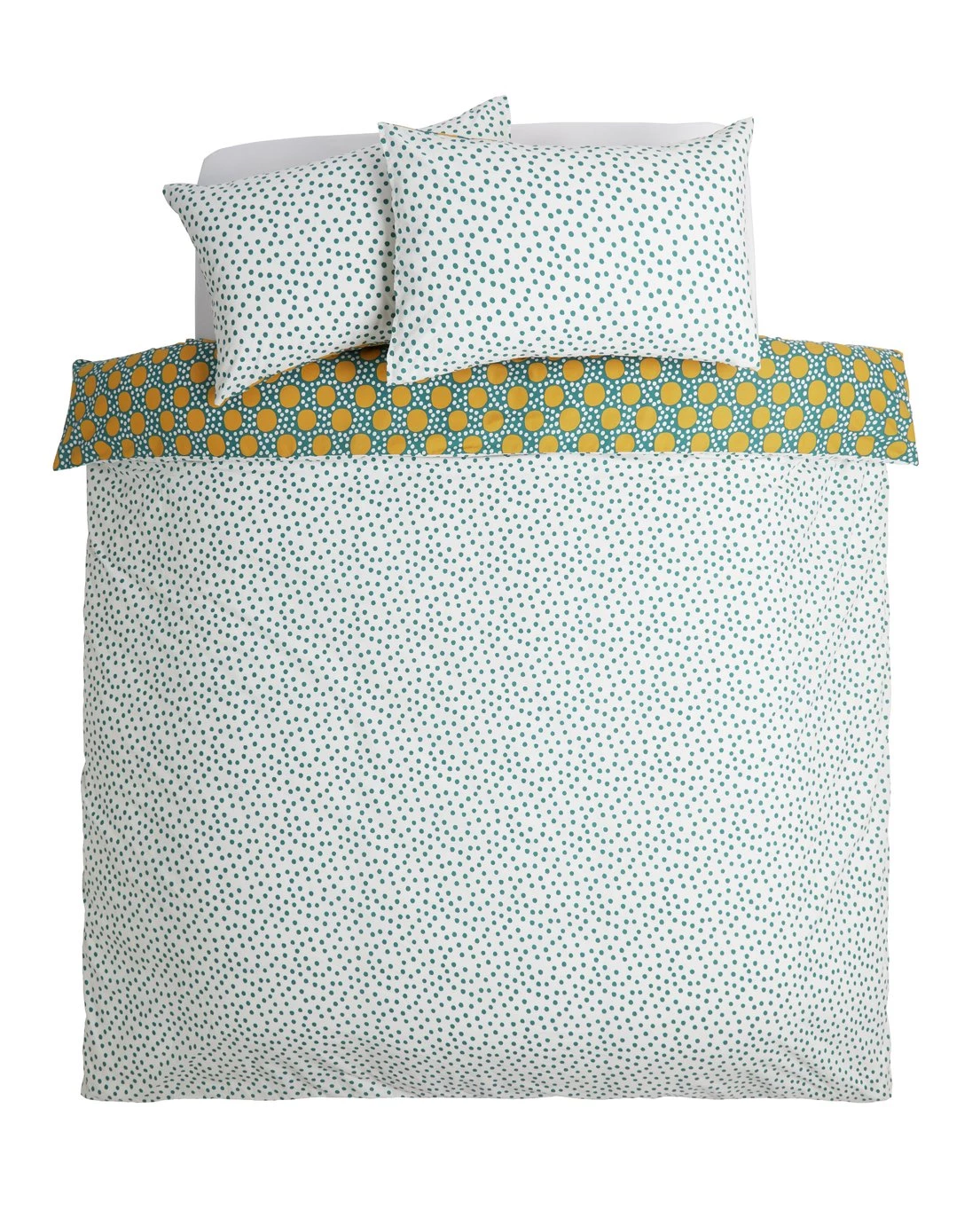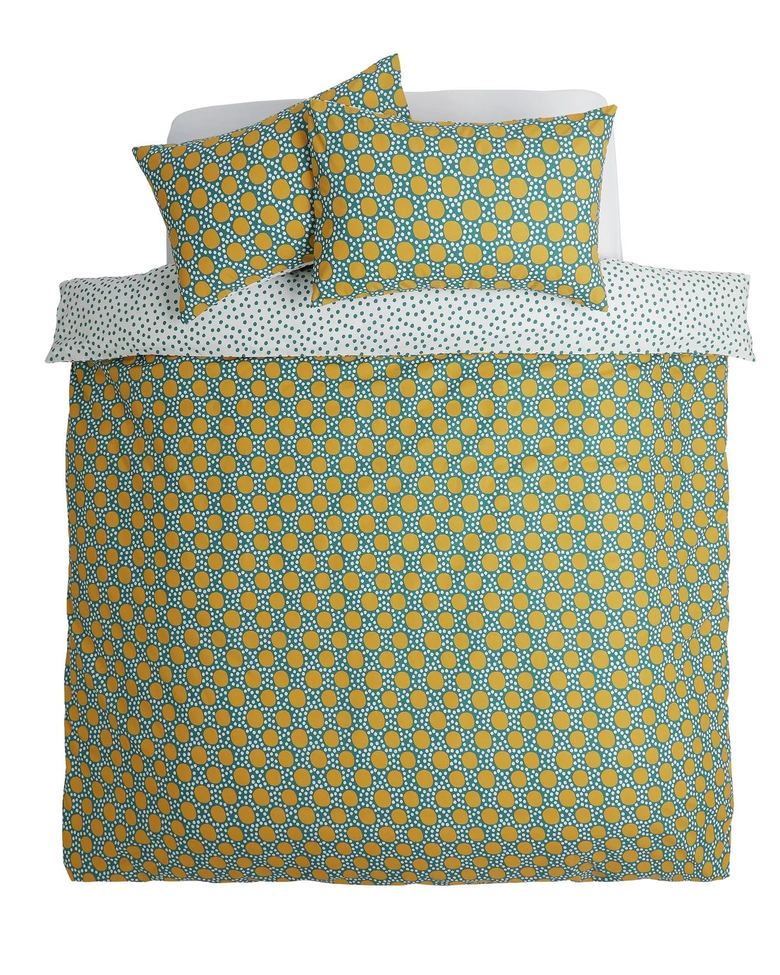 Good morning sunshine. Our Global Sunburst Geo bedding set features bold yellow graphics on one side and a spotted pattern on the other. Quite the showstopper. And made from a soft and airy polycotton blend, it's great for sinking into. Your daily dose of happy.