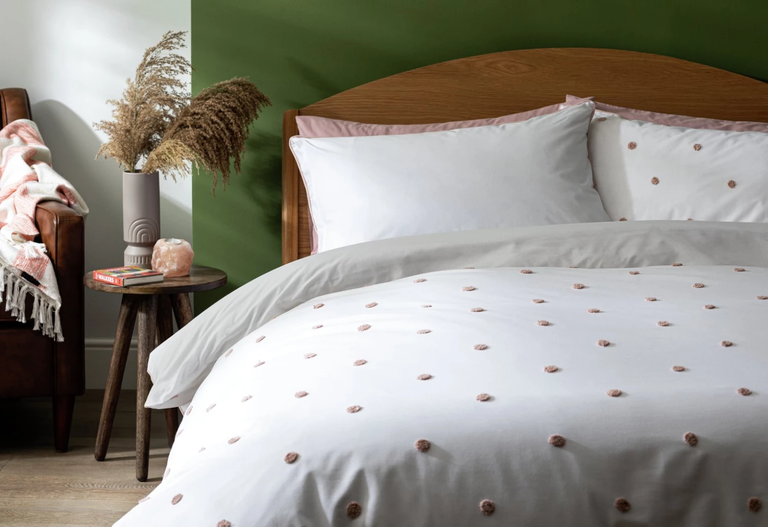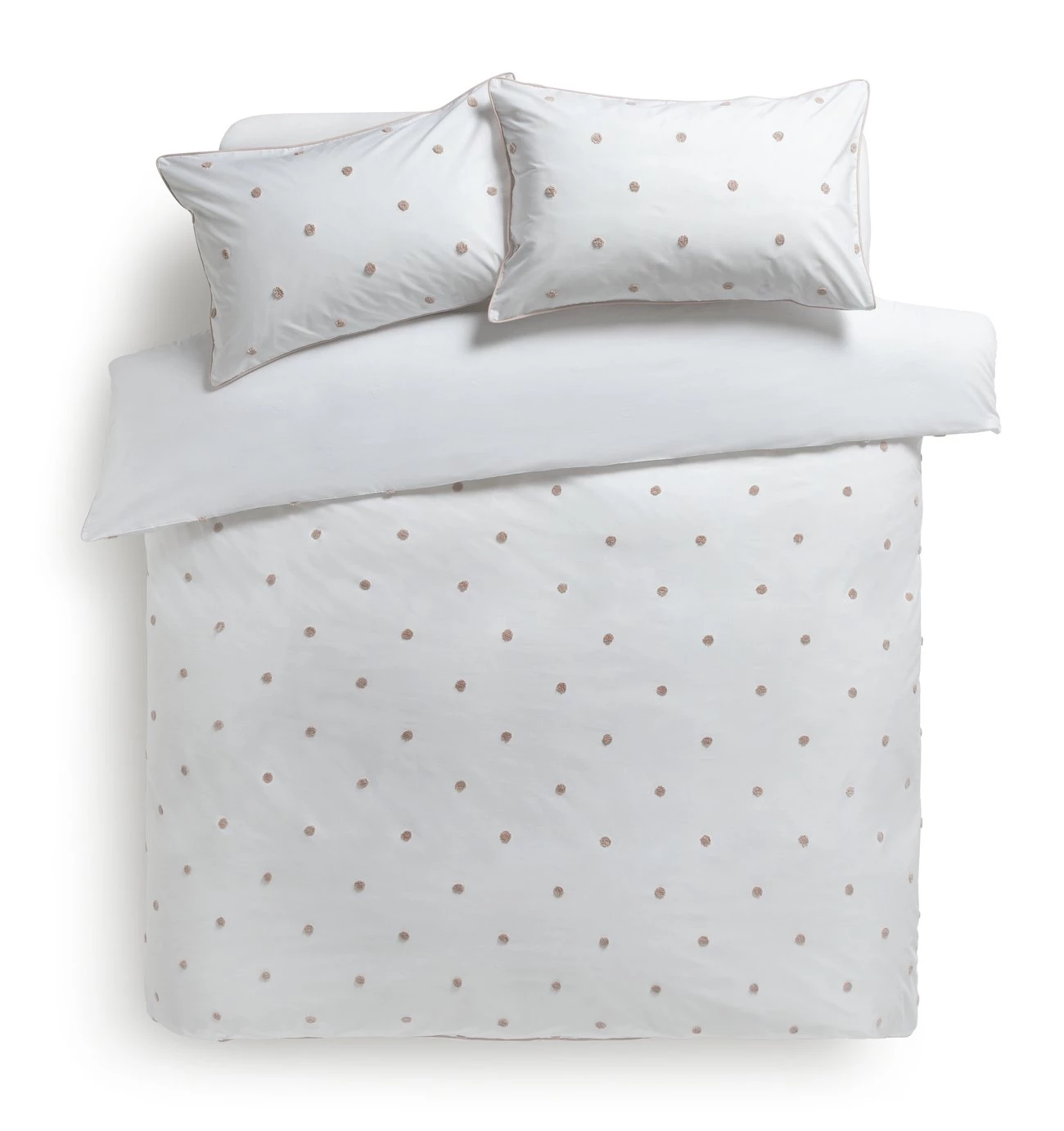 A duvet set that really hits the spot. The fresh white percale cover and matching pillowcases are enhanced with gentle pink tufted polka dots. Temptingly tactile. And with a 180-thread count, it's comfortably soft to sink into. Made from polycotton this bedding set is designed to last.