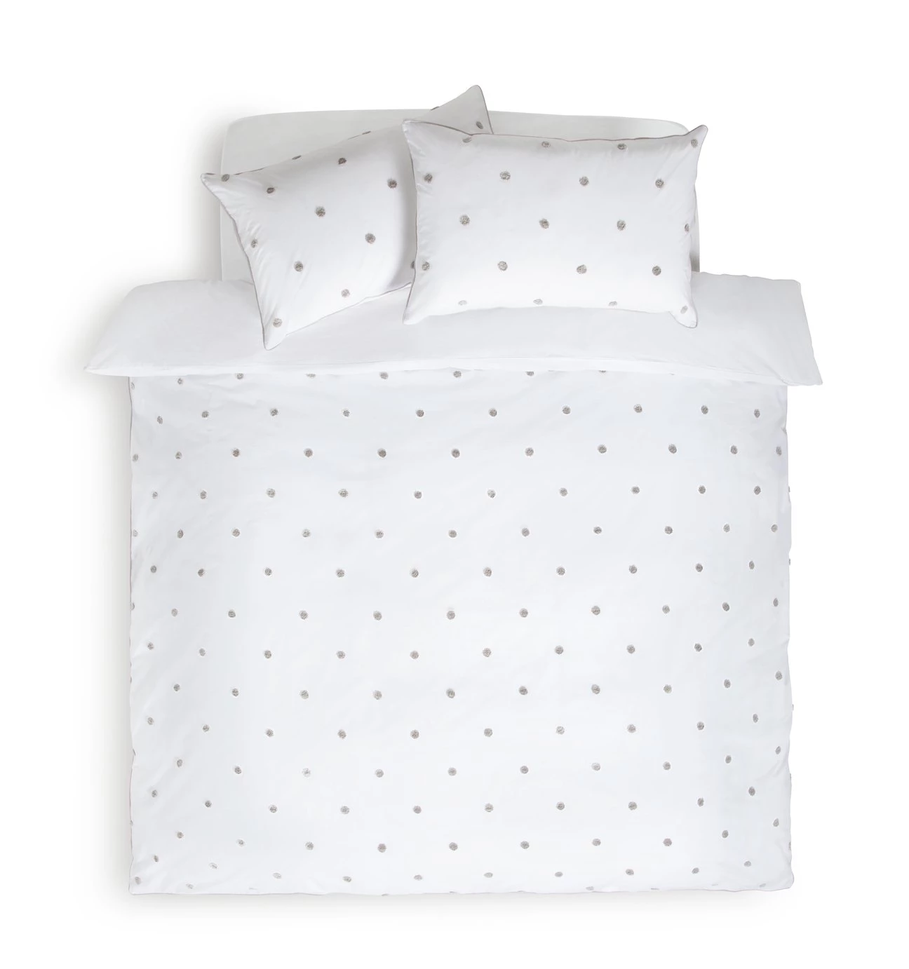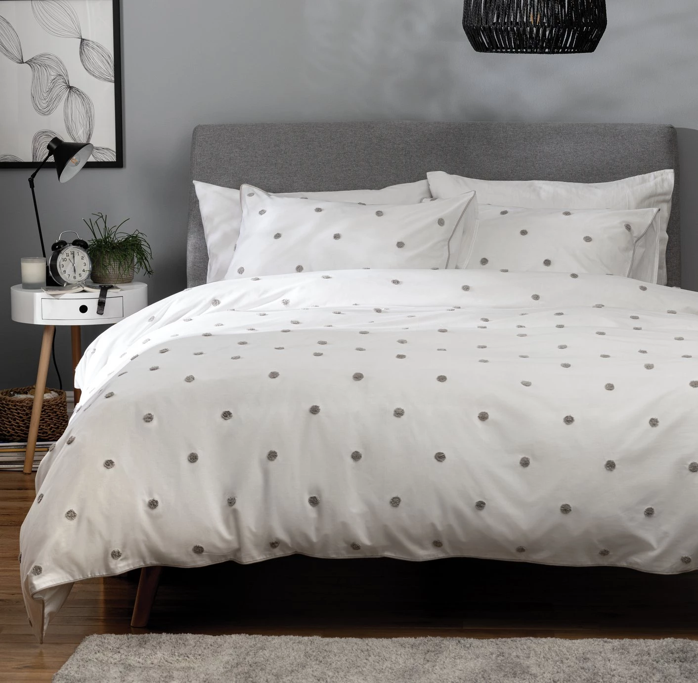 Deliciously dotty. Our tufted duvet set is pure simplicity. In fresh white and grey textured tufts, we love the way it lightens and brightens a bedroom. Delicate piping adds a final designer touch. Snuggle down and enjoy the temperature control that this type of cotton percale is known for. With a 180-thread count, it's soft, comfortable and all you need to sleep like a baby. Sweet dreams.