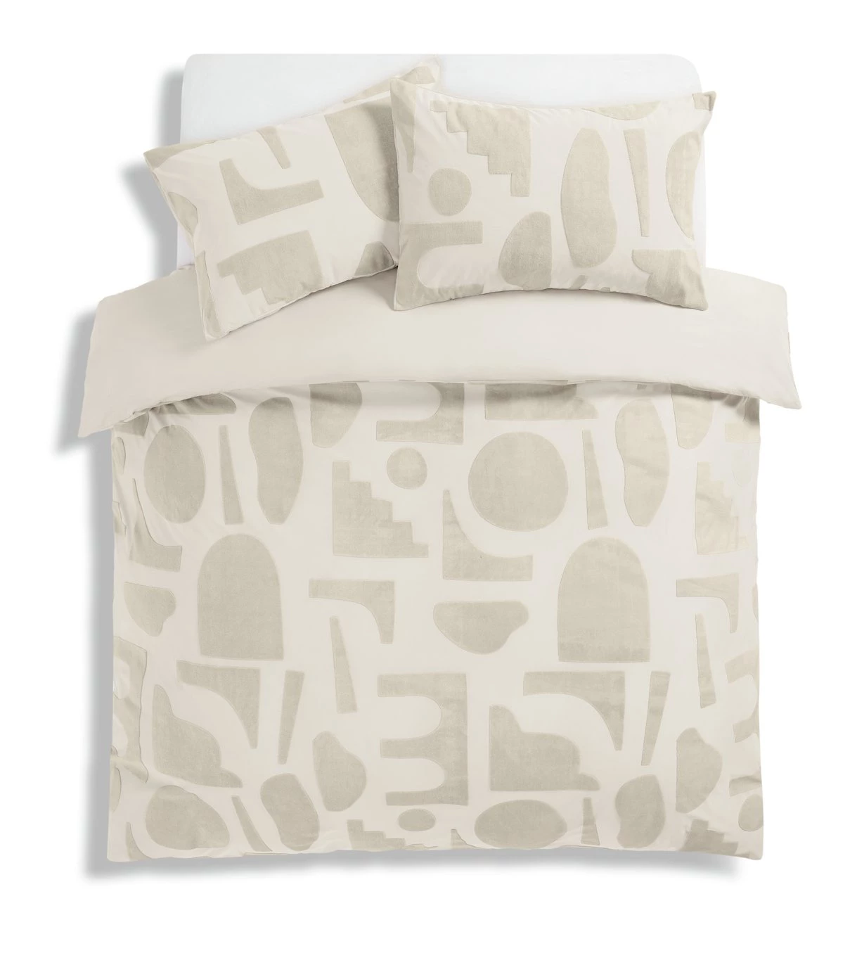 Shape up your sleep space. Our jacquard single bedding set is a medley of calm, contemporary and quirky. With its natural palette and modern geo shapes, it's a unique design with lots of personality. The distinctive velvet panels have a rich luxurious texture. Very snuggly cosy. Feeling drowsy yet?