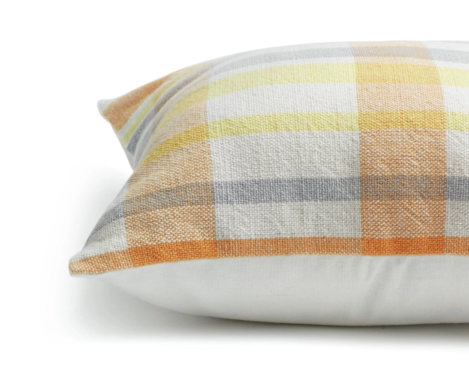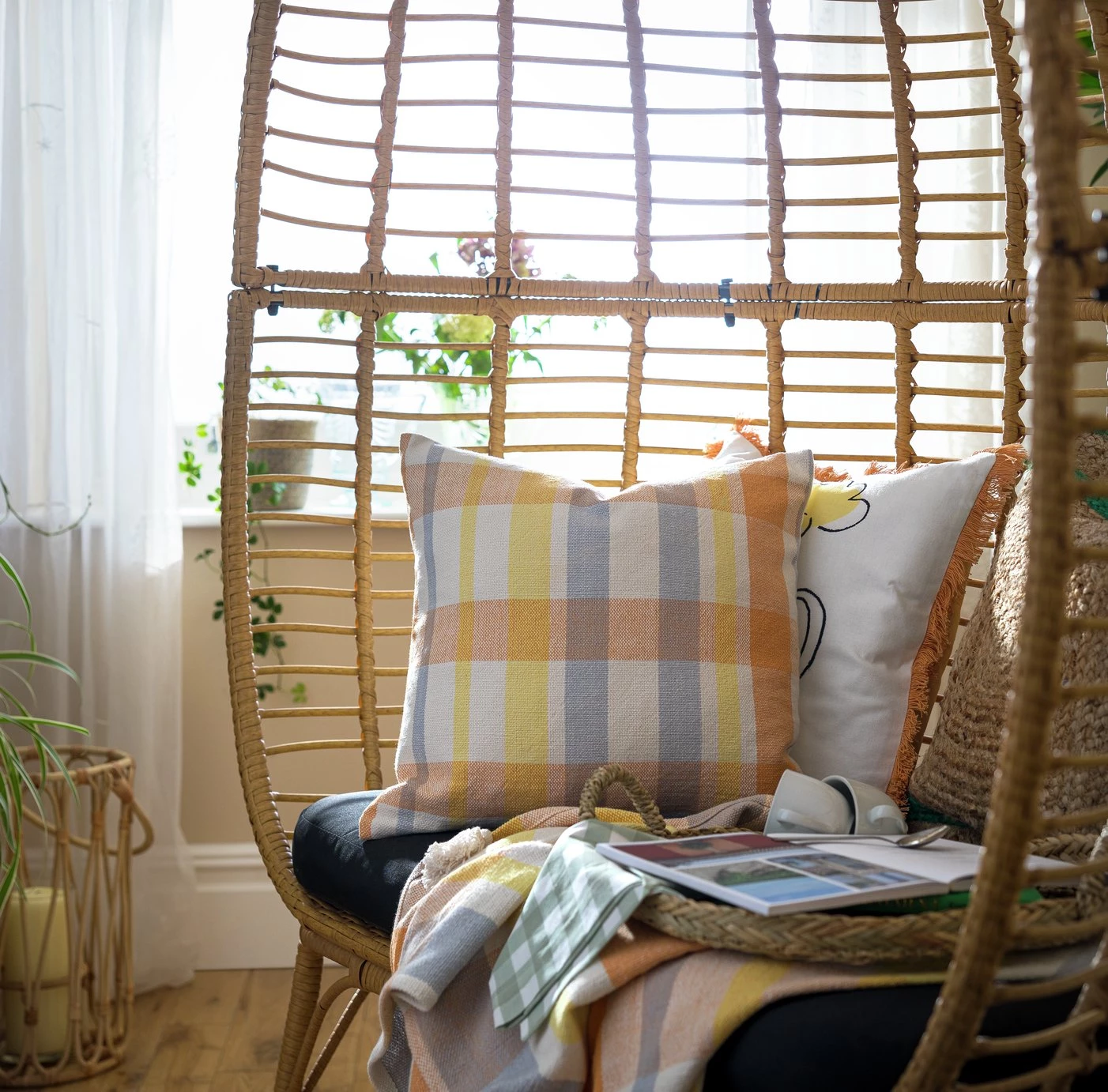 Getting your decor in check? Add a pop of pastel with this colourful cushion. Featuring a checked design in orange, yellow and grey it's full of the joys of spring. Made from 100% cotton with a comfy polyester filling, It's a snuggly, sunny statement for your sofa.