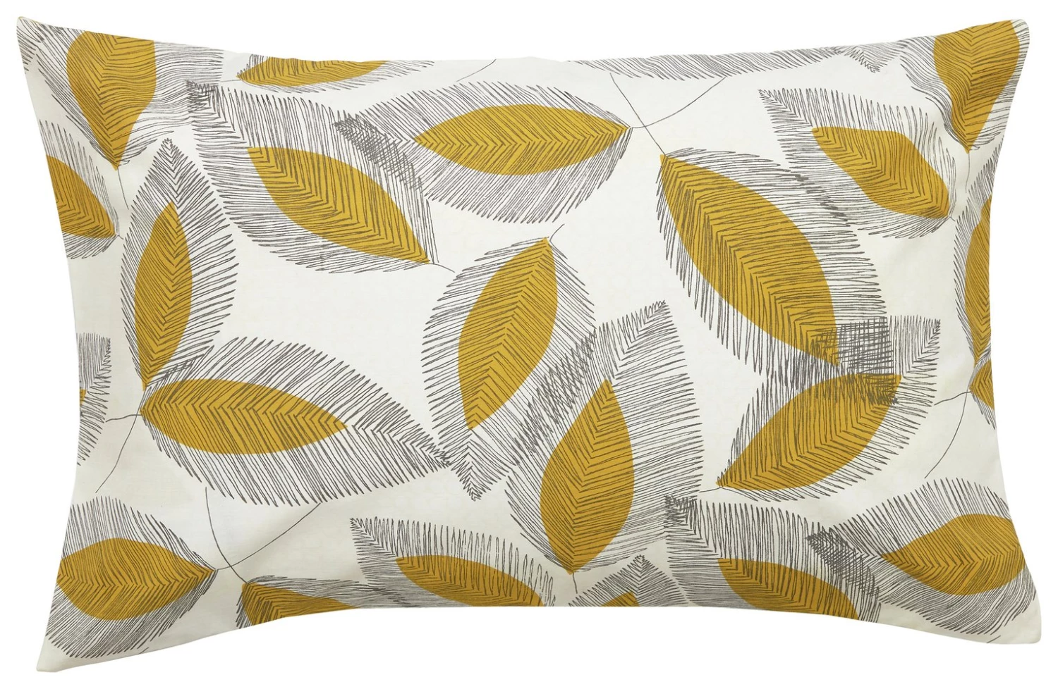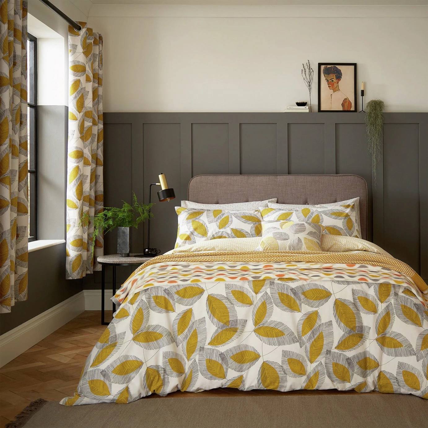 A striking design with an all over hand-drawn leaf pattern in ochre and charcoal tones all settled on an off-white base. The lively front reverses to a simple stamped circle design all over.