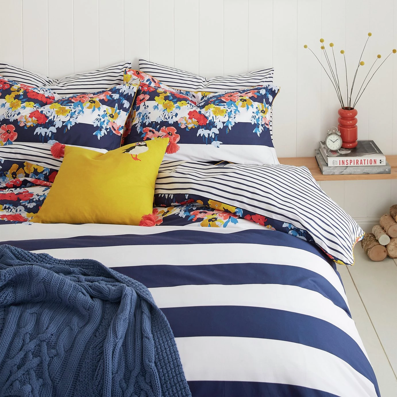 Alive with colours inspired by the St Ives coast, this duvet set will brighten up the bedroom and give you another reason to smile in the mornings. Its colourful floral print stands out against a nautical horizontal stripe in a way that distinctively says 'that's Joules'. You'll find a thinner stripe reverse and premium finishing touches to the set such contrasting gold cord piping around the edges.