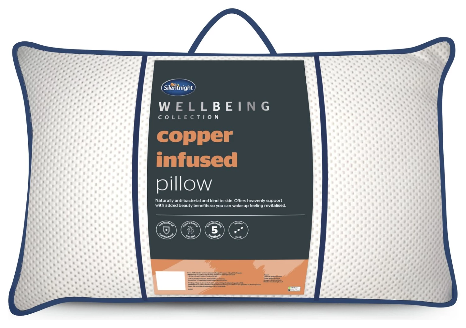 Wake up feeling rejuvenated with the Silentnight Copper Infused Pillow. Crafted with 30% more copper content than other pillows in the market, the premium copper infused cover offers natural beauty benefits. Praised for its cooling properties, copper can help you to re-charge improving your wellbeing as you sleep. Copper's natural anti-bacterial properties can help reduce skin irritations and inflammation caused by allergens, dust mites and bacteria. Deeply filled with a soft knitted cover, the pillow is also machine washable.