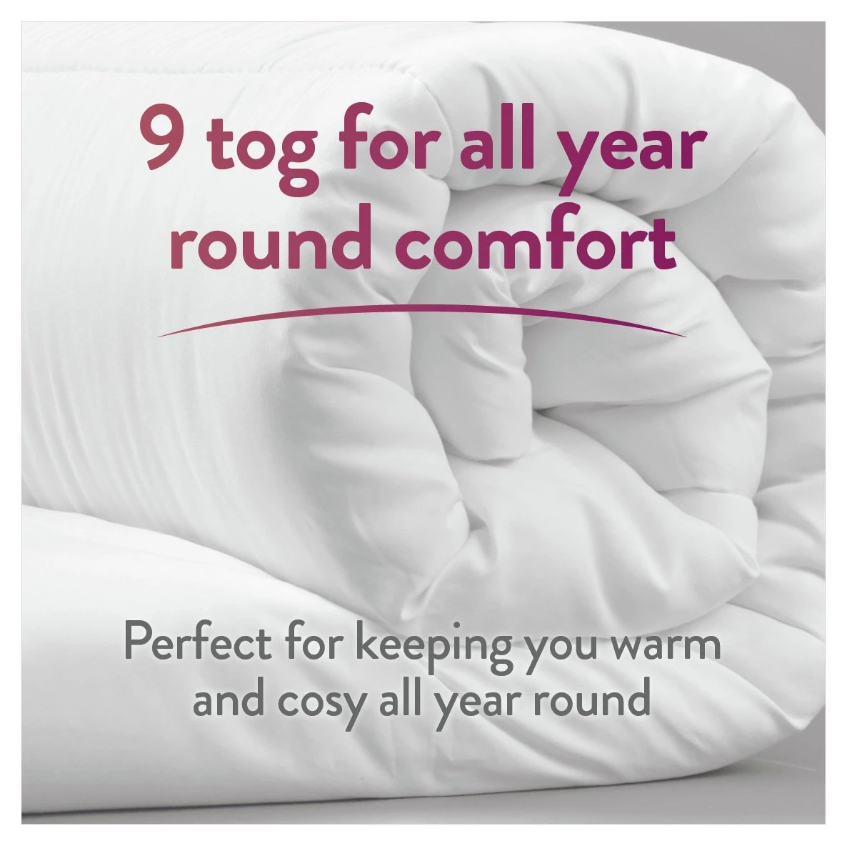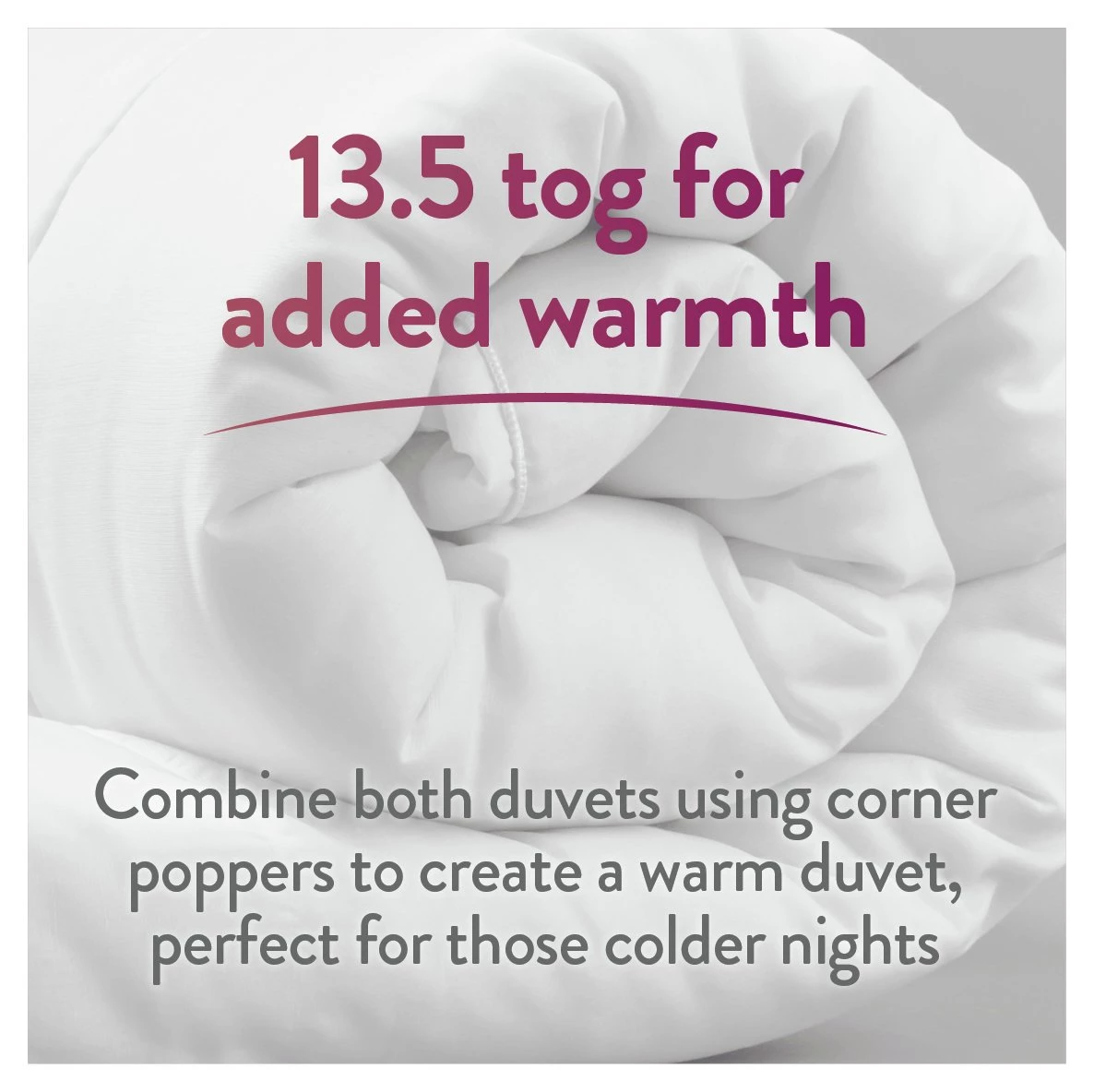 At Slumberdown, we believe every body deserves a better night sleep. The All Seasons Duvet is perfect for all year round use. The 4.5 Tog duvet keeps you cool on warmer nights and the 9 Tog is perfect as temperatures drop. The duvets can be combined with corner poppers to create a 13.5 Tog duvet, which will ensure you stay warm on the cold nights. What's more, the product is Easy Care which means its machine washable and can be tumble dried.
