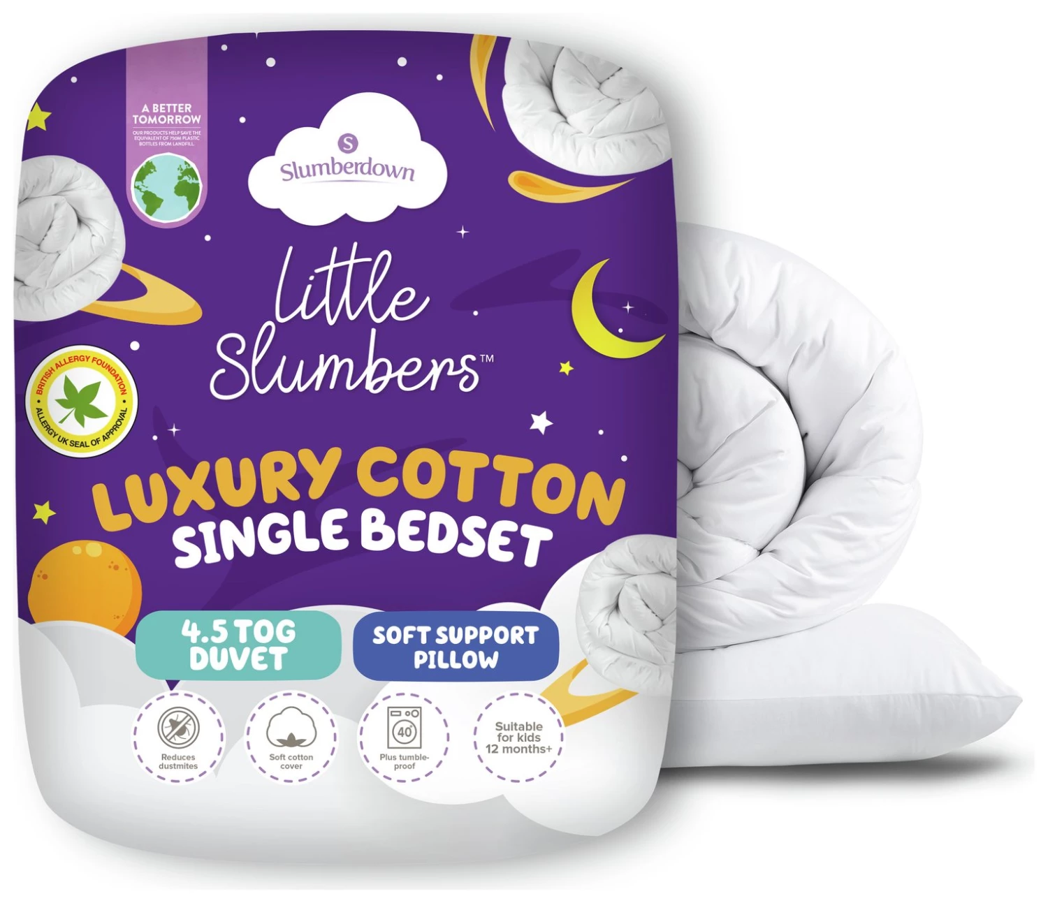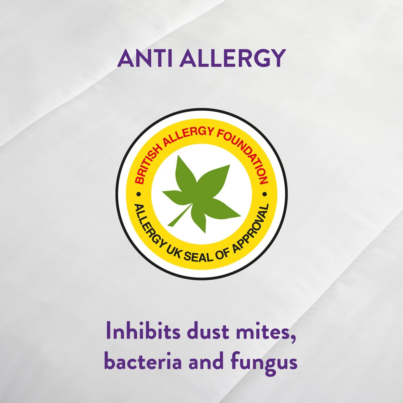 The Slumberdown Allergy Protection bedset has been created for children. This lovey soft touch cotton duvet is 4.5 Tog which is ideal for children as they tend to overheat quicker. The pillow has the same soft touch cotton over and a reduced fill to ensure it provides the right support for smaller heads and necks. Due to its unique filling this product has Allergy UK's seal of approval, which is awarded to products that have been tested to very high standards by leading allergy specialists, providing asthma, allergy and dustmite protection.