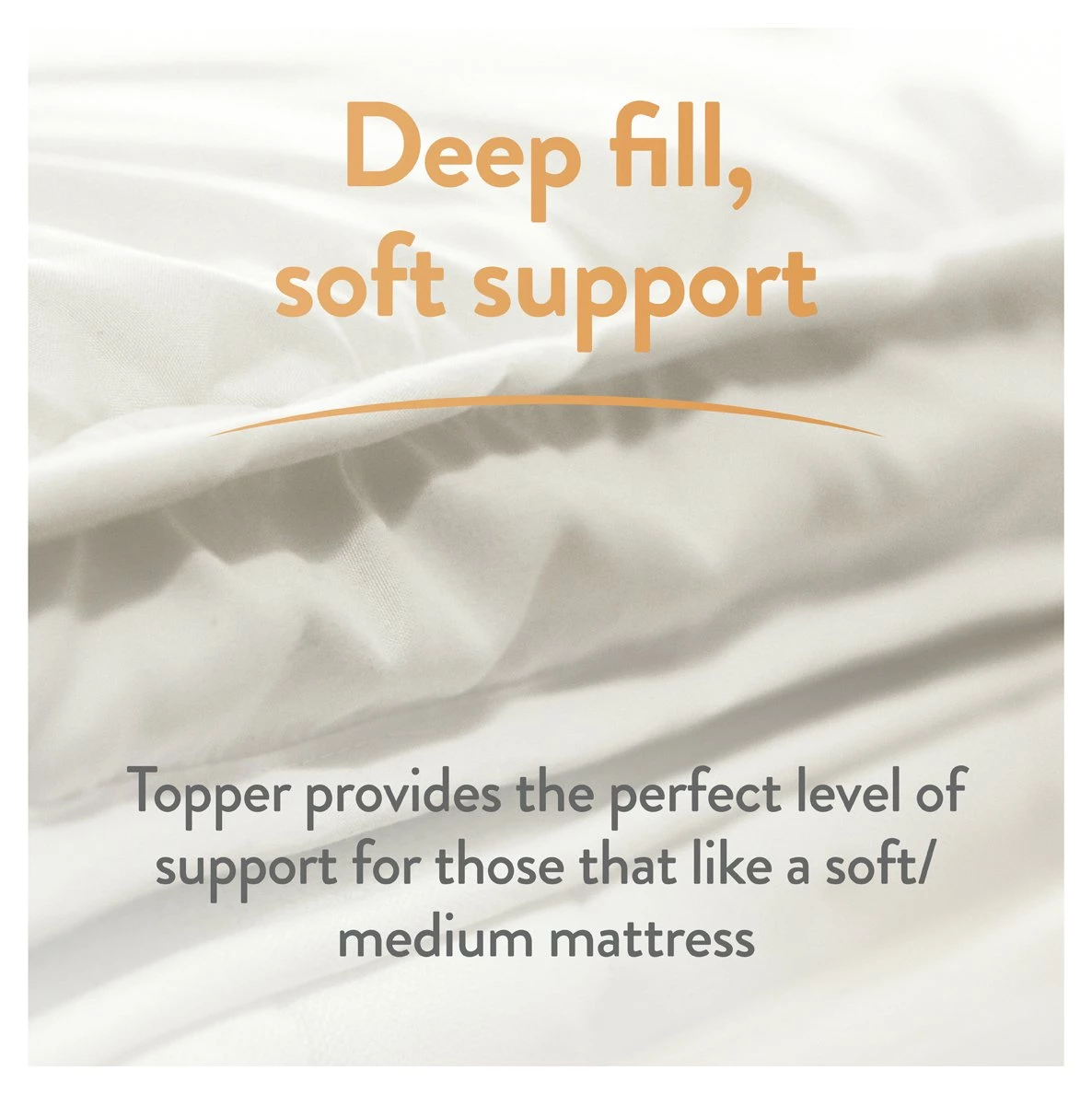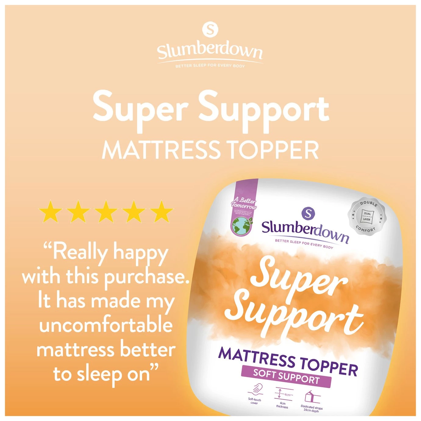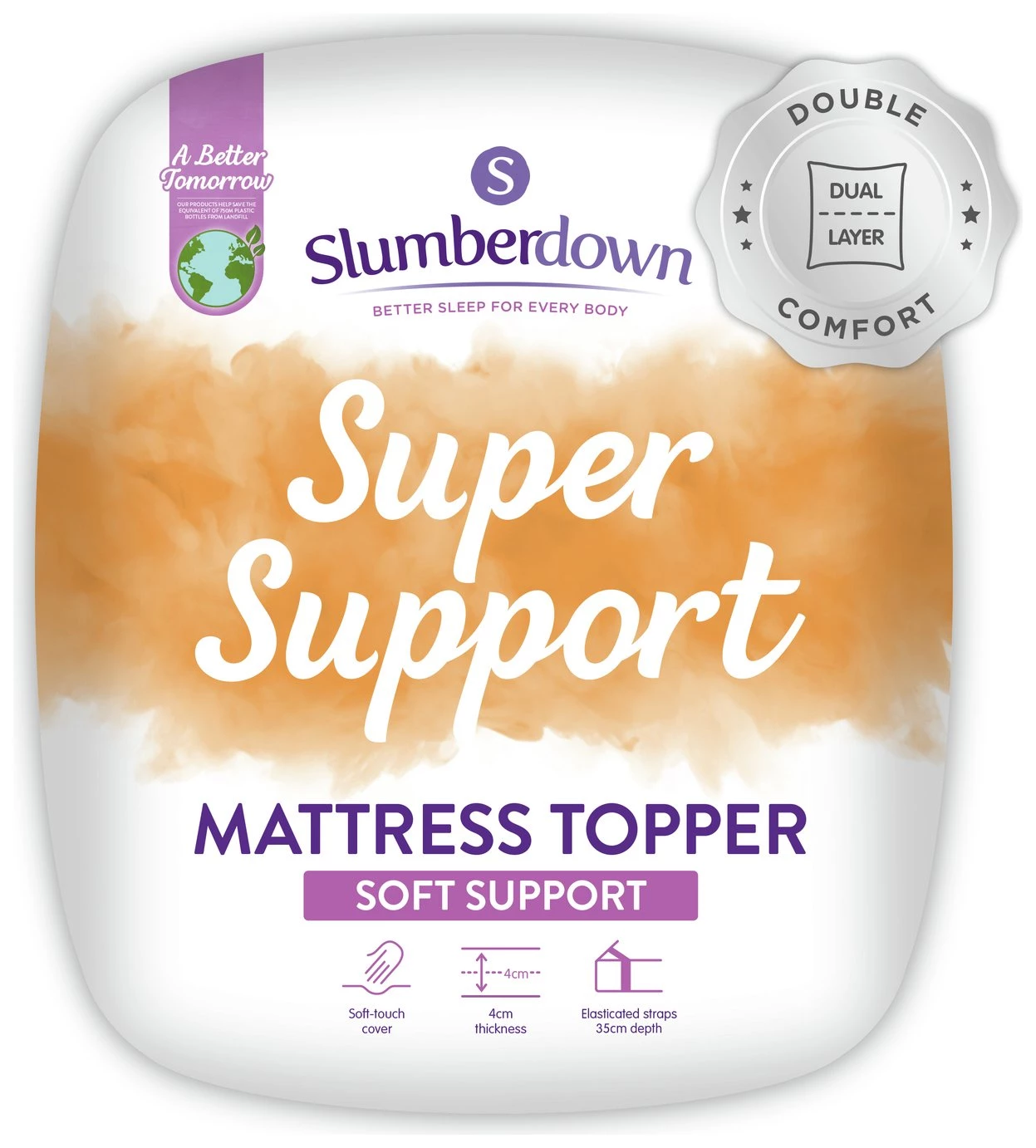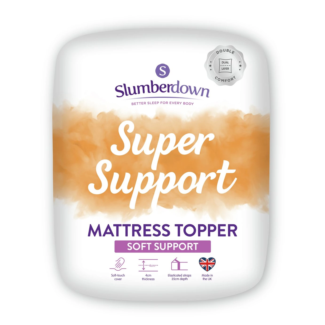 The Slumberdown Super Support Topper provides an additional level of support for your mattress . Two soft touch toppers are connected by a breathable middle layer which gently supports the contours of your spine, whilst allowing the air to circulate and remove any heat build up. The topper is designed to offer a soft level of support and is ideal for people who prefer a soft/medium mattress. The topper fits to the mattress with re-inforced elasticated straps which will fit a mattress depth of up to 30cm.