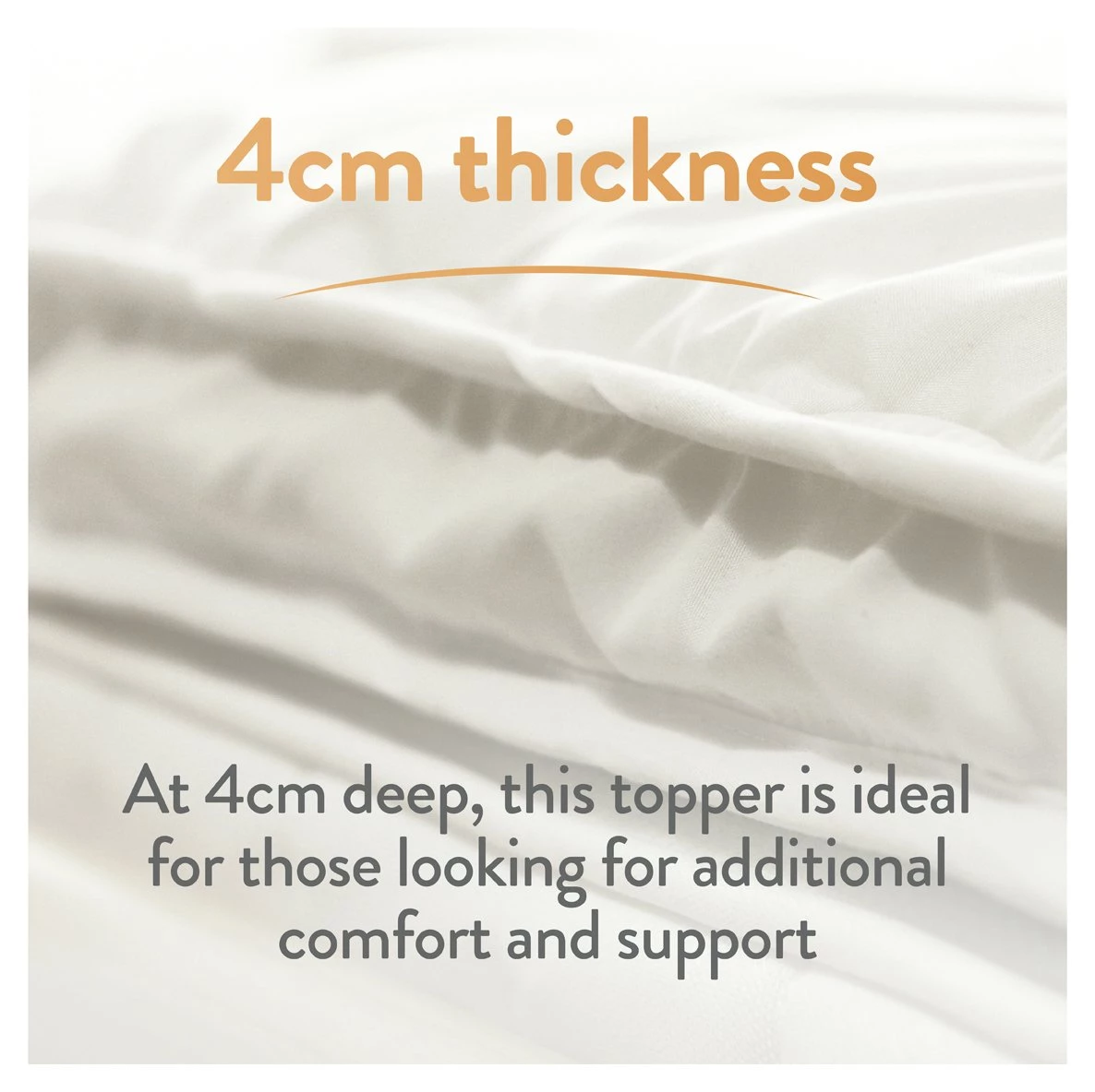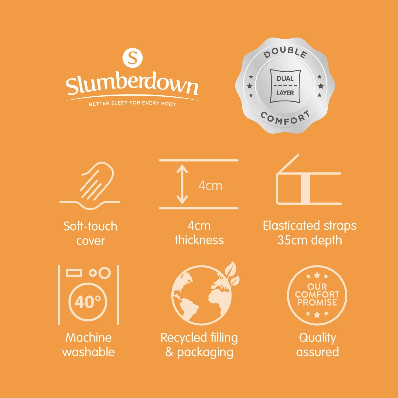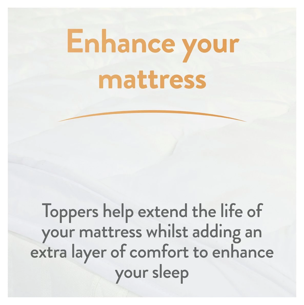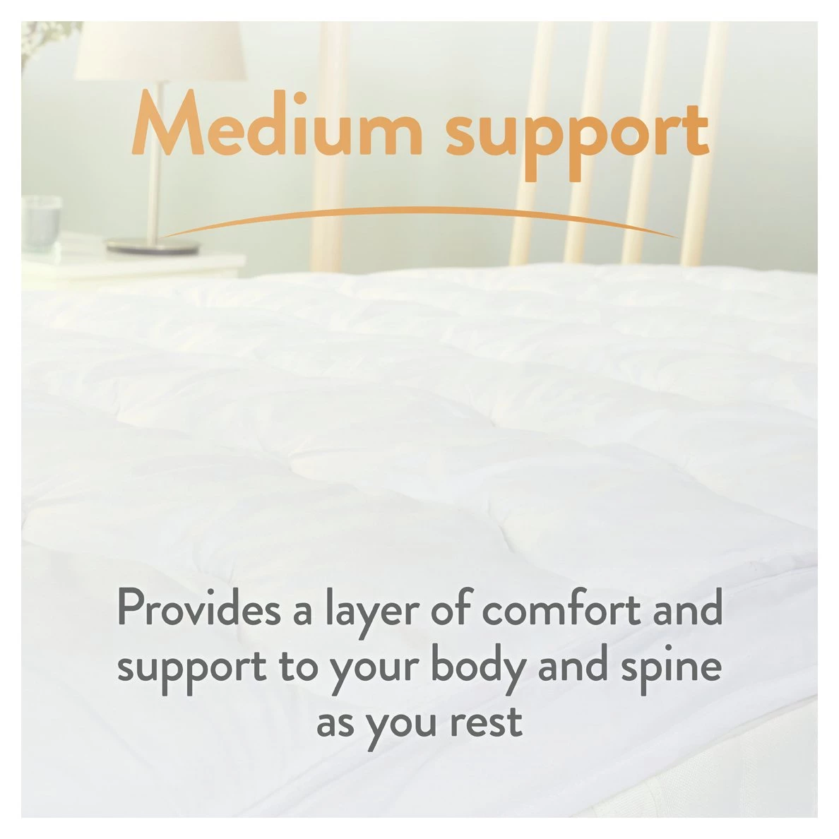 The Slumberdown Super Support Topper provides an additional level of support for your mattress . Two soft touch toppers are connected by a breathable middle layer which gently supports the contours of your spine, whilst allowing the air to circulate and remove any heat build up. The topper is designed to offer a soft level of support and is ideal for people who prefer a soft/medium mattress. The topper fits to the mattress with re-inforced elasticated straps which will fit a mattress depth of up to 30cm.