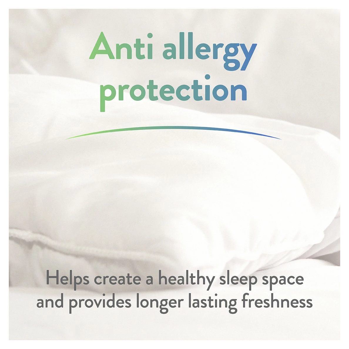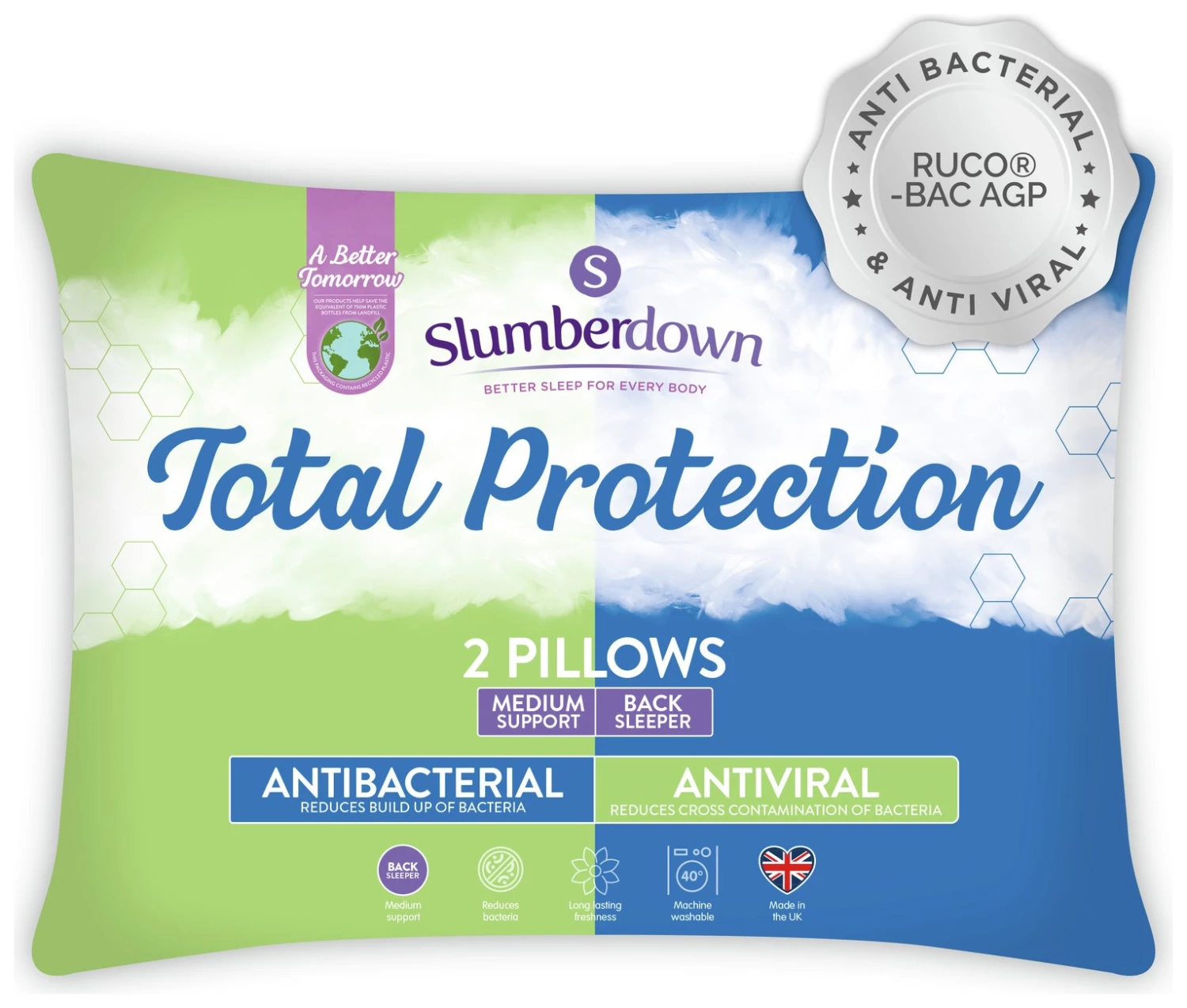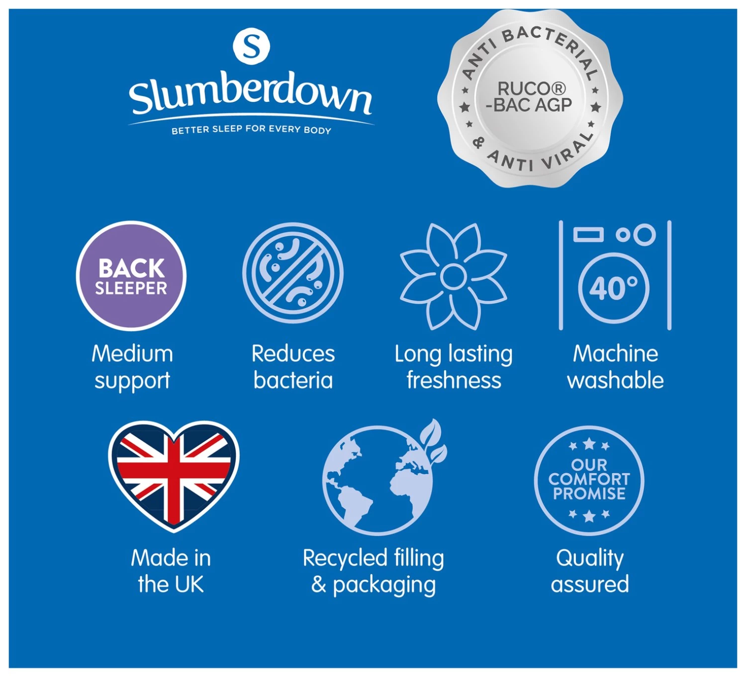 The Slumberdown total protection range has been formulated using a fast acting anti bacterial and anti viral treatment, allowing you to have all the benefits of an anti allergy product with the added anti viral protection, resulting in a fresher and healthier sleep space. The soft touch cover offers great support for your head and neck, ensuring you wake up refreshed, the pillow offers Medium support which is ideal if you sleep on your front or back. What's more the product is easy care which means its machine washable and can be tumble dried.