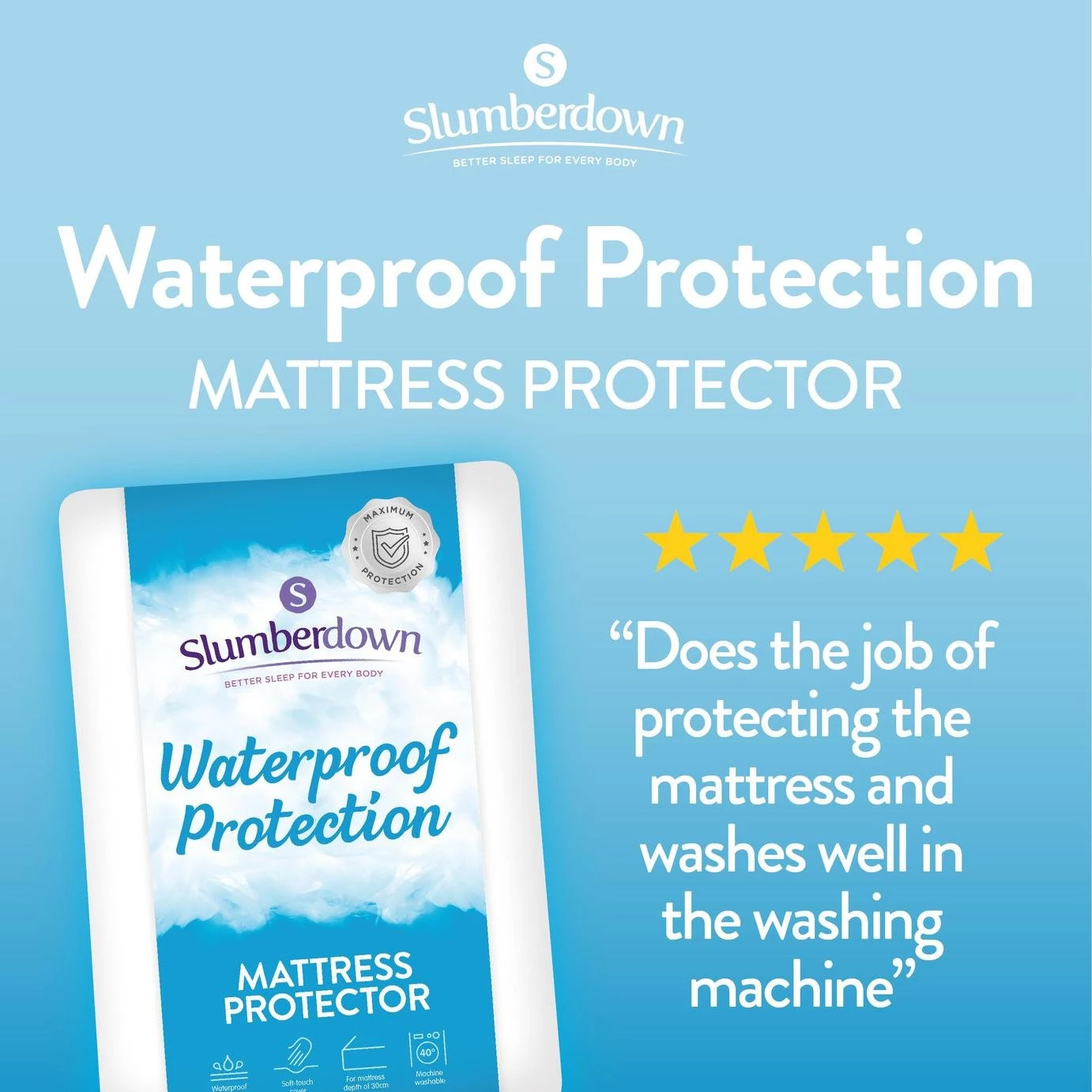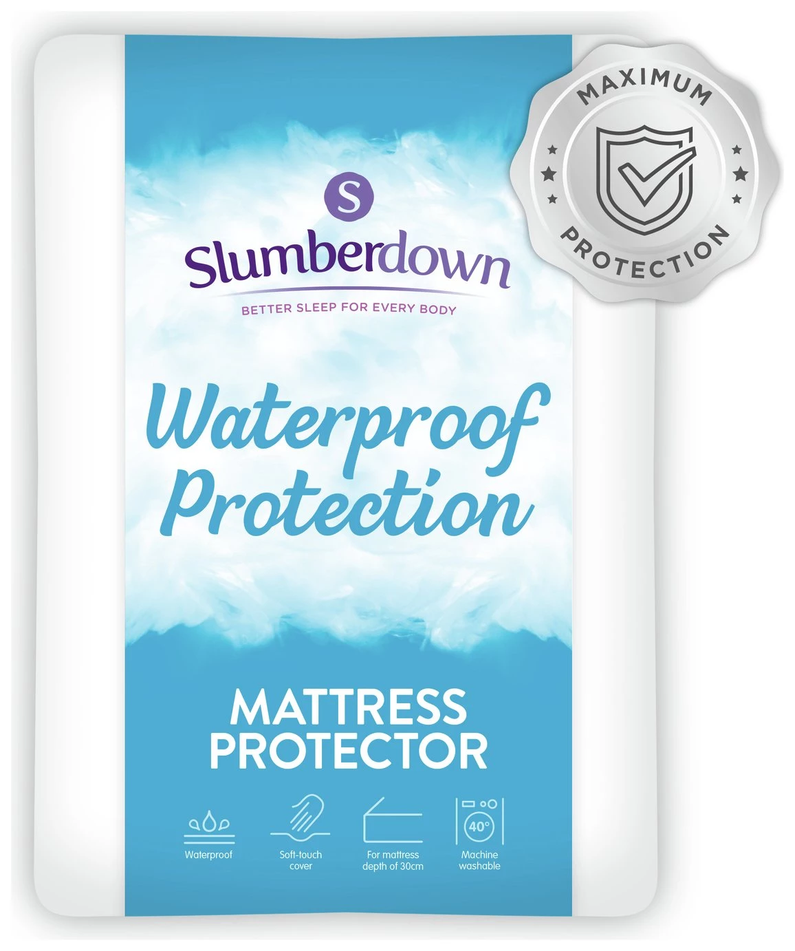 The Slumberdown Total Waterproof Protection Range offers maximum protection for your mattress. This soft touch waterproof protector is fully waterproof and covers the mattress face and skirt, ensuring the mattress is fully protected from any unwanted spills or accidents. This mattress protector is designed to fit a matress depth of up to 30cm. Whats more its Easy Care which means its machine washable.