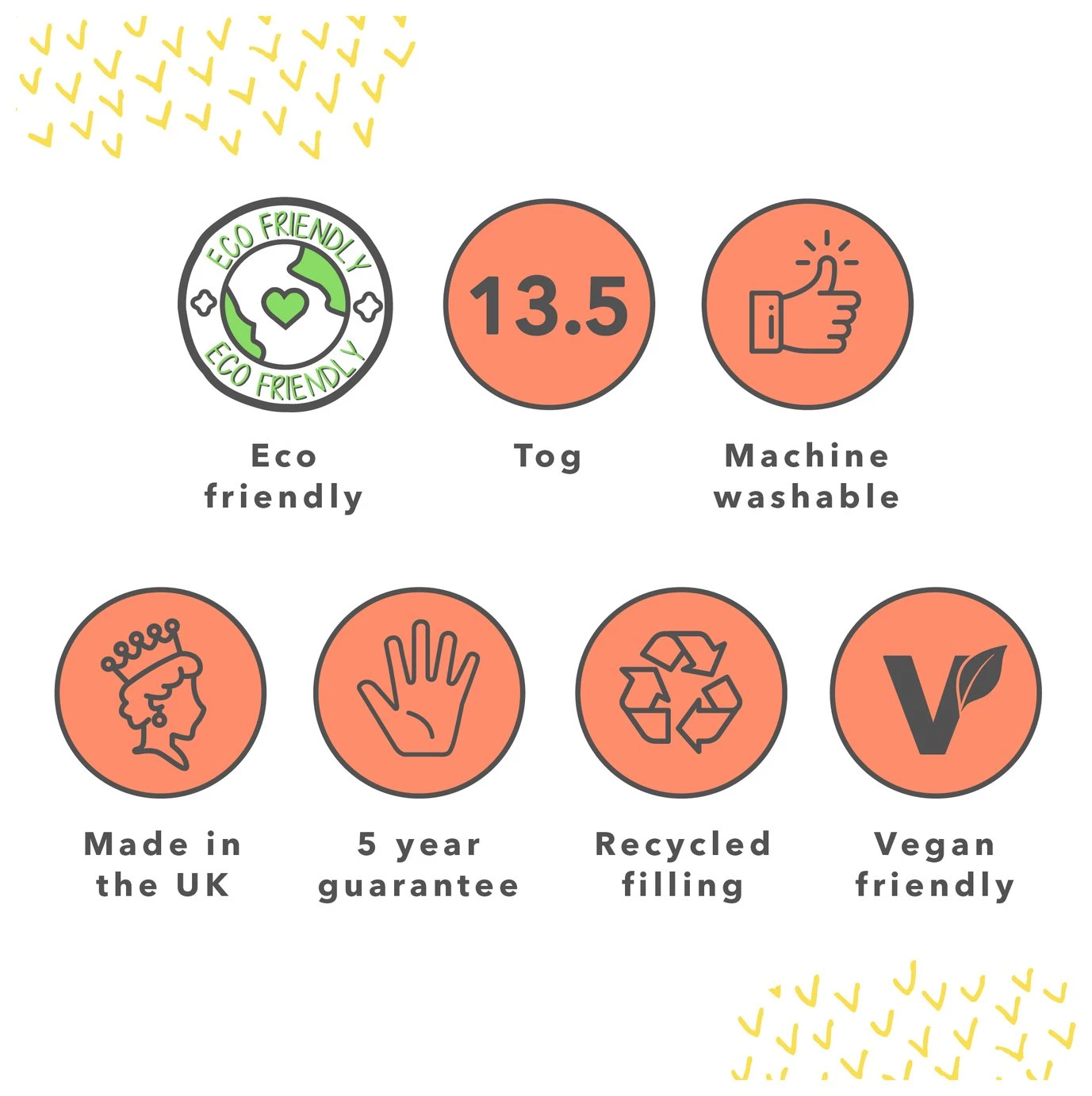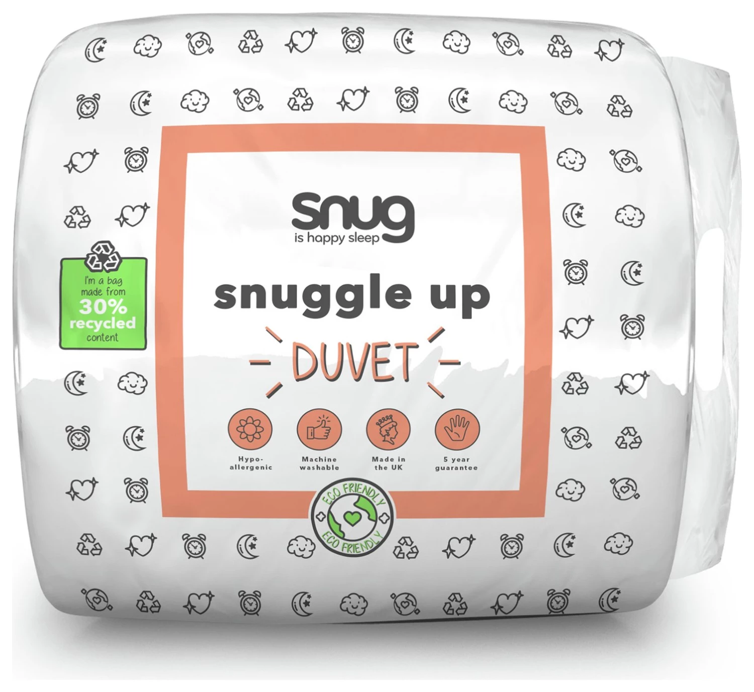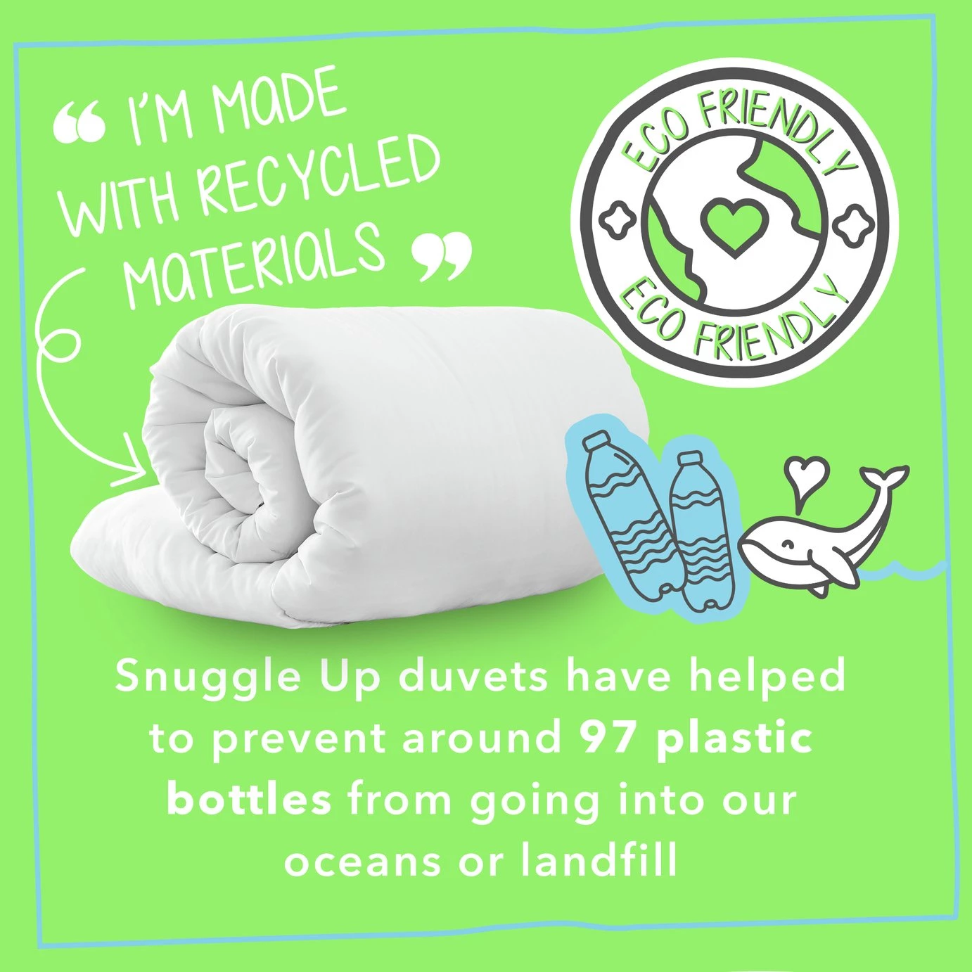 Cosy up and enjoy snoozy snuggles. The Snuggle Up duvet is made with soft covers and filled with oodles of squidgy fibres, keeping you super cosy all-night long, the perfect snuggle partner for chilly winter nights! The duvet is filled with recycled materials giving our lovely planet a helping hand. We care so you can be carefree, the squidgy fibres were once plastic bottles that have experienced a wonderful makeover. Our packaging is made from 30% recycled materials and can be fully recycled.