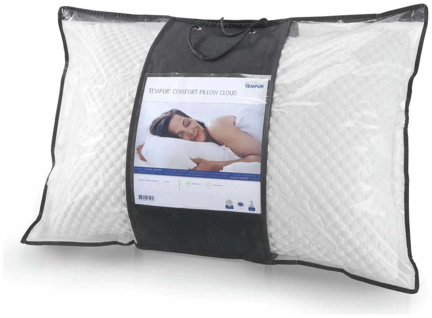 The TEMPUR Comfort Pillow Cloud comes with a 3 year guarantee. It is a classic rectangular shape and will fit any standard sized pillow case. The dual sided soft textured cover is removable for washing at 60C, and is quick drying.